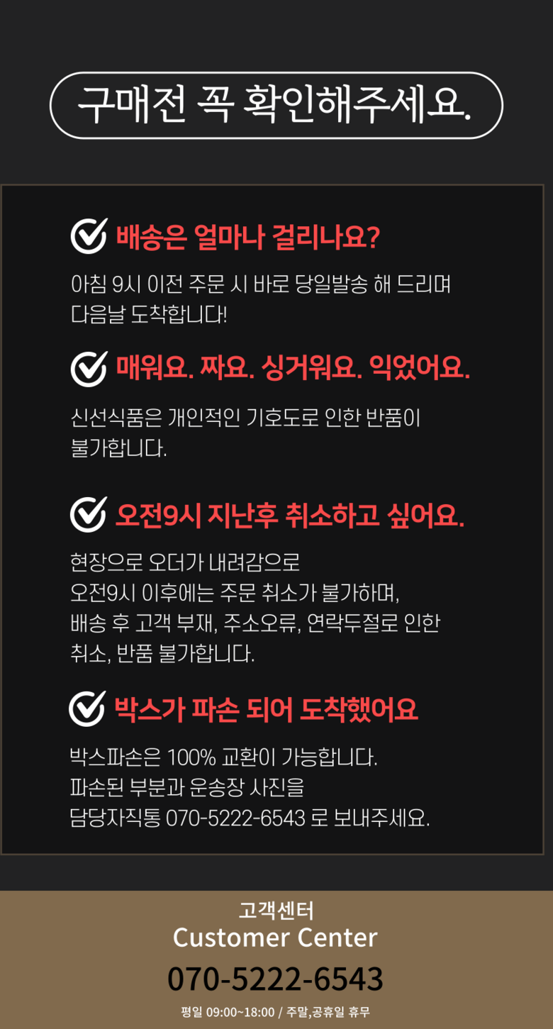 | 배송방법 | 신선/냉장/냉동 | 배송비 | 무료배송 - 도서산간 지역 배송불가 |