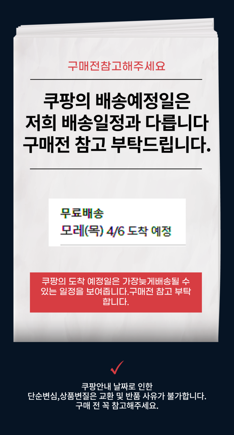 - ㆍ모니터 해상도의 차이로 인해 색상이나 이미지가 실제와 달라, 고객이 단순 변심으로 교환/반품을 무료로 요청하는 경우