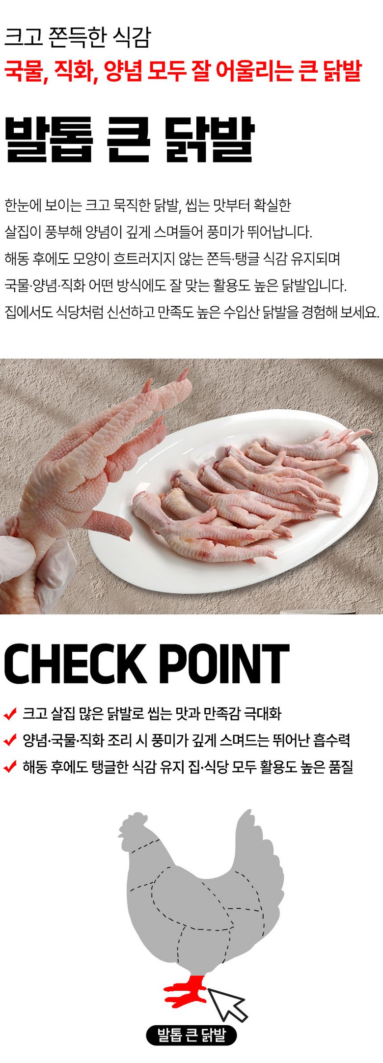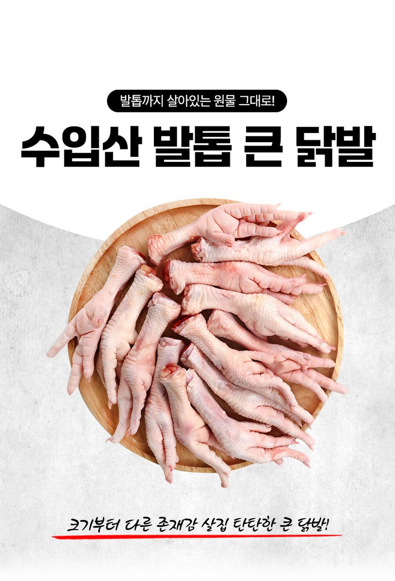 | 품목 또는 명칭 | 닭발 | 포장단위별 내용물의 용량(중량),수량,크기 | 상품 상세페이지 참조 |