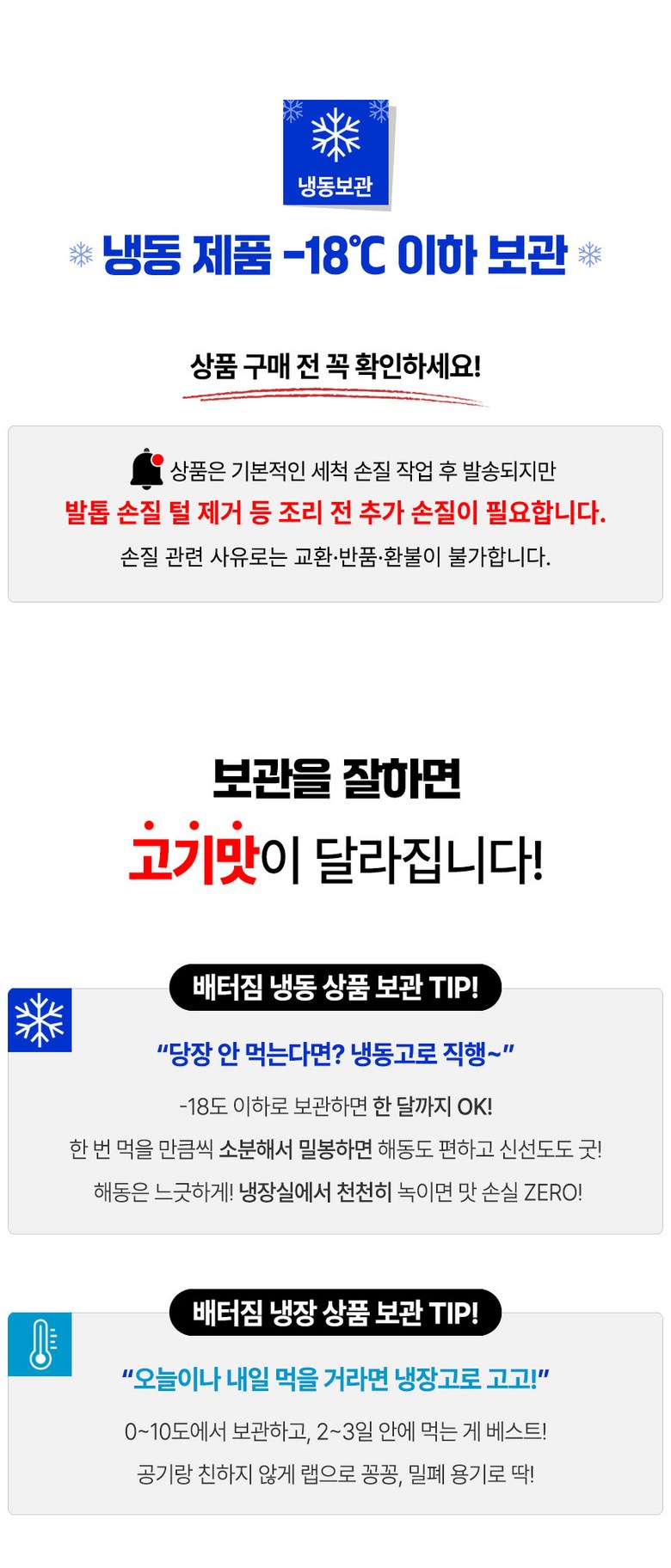| 계절상품/식품/화장품 | ㆍ신선/냉장/냉동 상품의 단순변심의 경우 ㆍ뷰티 상품 이용 시 트러블(알러지, 붉은 반점, 가려움, 따가움)이 발생하는 경우, |