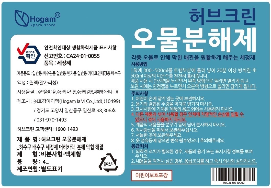| 품목 및 제품명 | 세정제 / 허브크린 오물분해제 하수구 배수구 세정제 머리카락 분해 막힘 해결 | 용도(표백제의 경우 계열을 함께표시) 및 제형 | 일반용-배수관용, 변기용, 기타표면세정용(배수구) / 비분사형-액체형 |