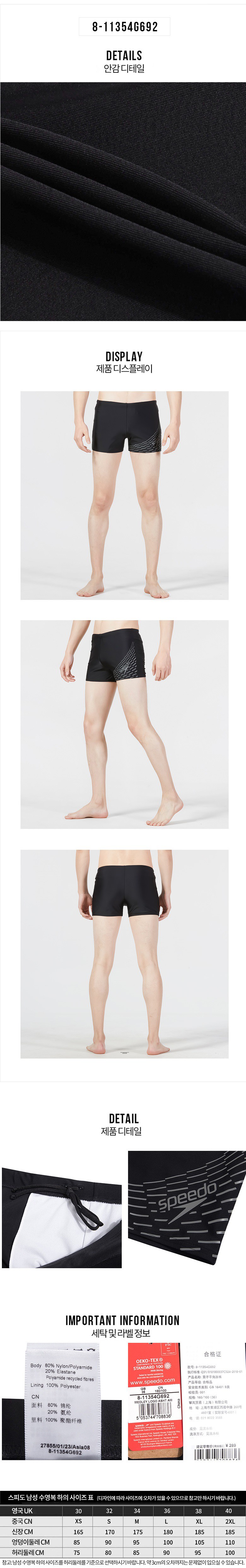 착용감이 편안한 스피도 남성용 사각 수영복입니다. 메인 원단은 나일론 80%, 스판덱스 20%이며, 안감은 폴리에스테르로 되어 있습니다.