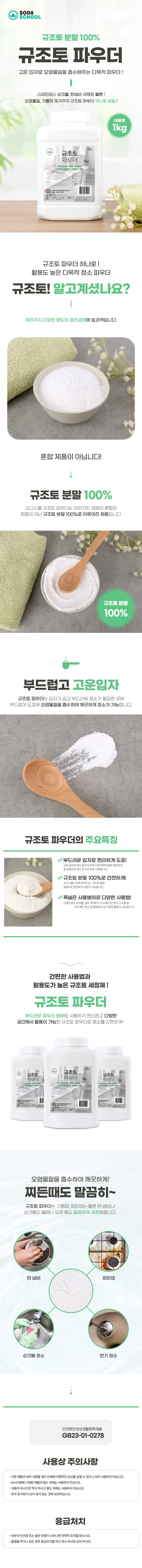 | 품목 및 제품명 | 세정제/소다스쿨 규조토 파우더 | 용도(표백제의 경우 계열을 함께표시) 및 제형 | 일반용-기타표면세정용-싱크볼용, 가스레인지용, 바닥용 등/분말형 |
