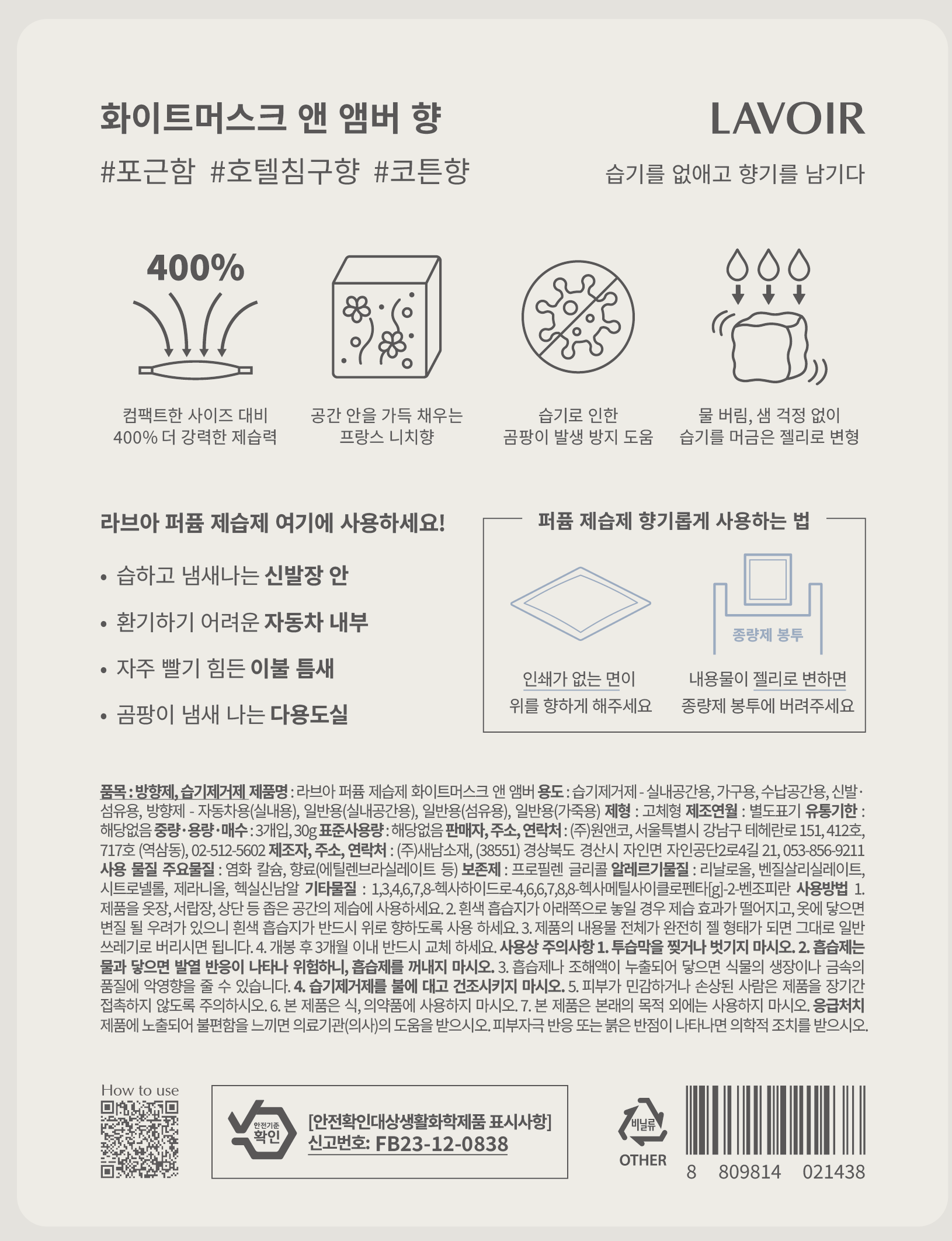 | 품목 및 제품명 | 습기제거제, 방향제 / 라브아 퍼퓸 제습제 화이트머스크 앤 앰버 | 용도(표백제의 경우 계열을 함께표시) 및 제형 | 습기제거제 - 실내공간용, 가구용 , 수납공간용, 신발·섬유용, 방향제 - 자동차용(실내용), 일반용(실내공간용), 일반용(섬유용), 일반용(가죽용) / 고체형 |