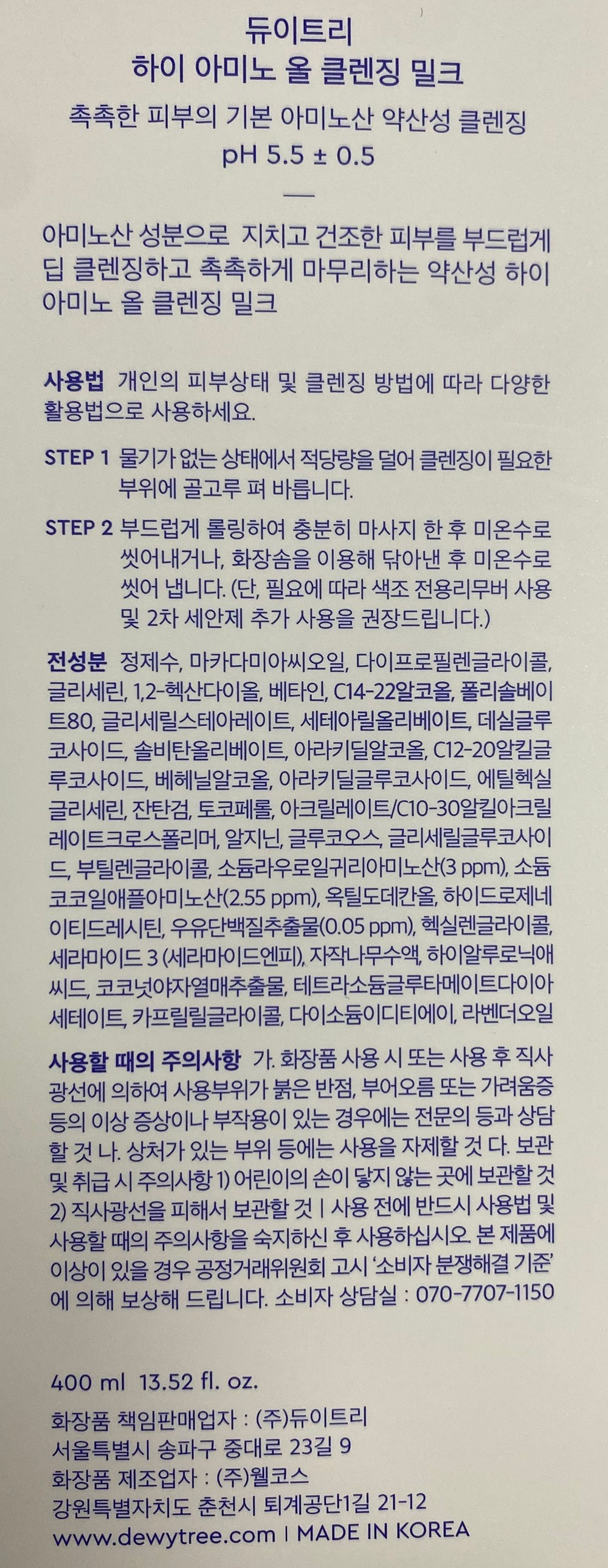 | 용량(중량) | 400ml | 제품 주요 사양 | 모든 피부용 |