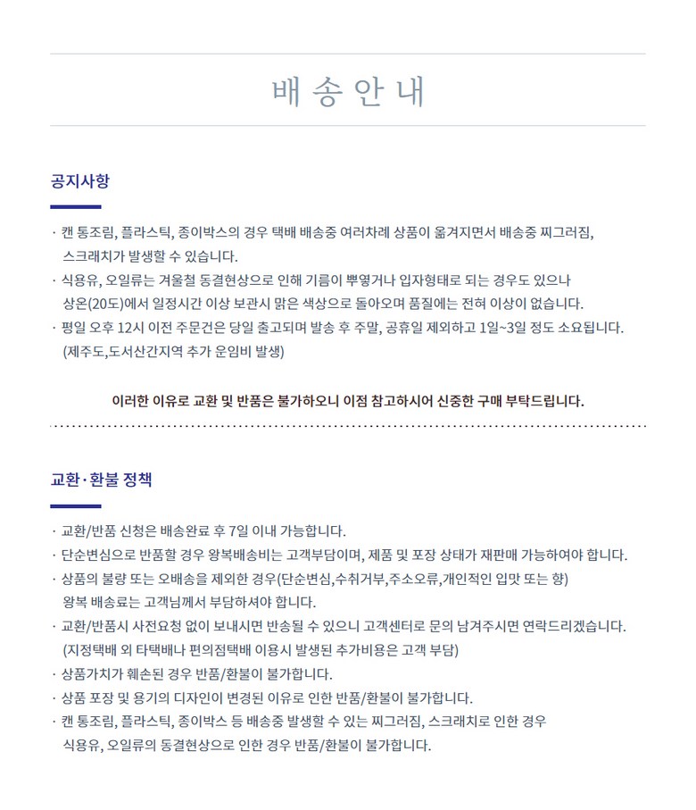 | 배송방법 | 순차배송 | 배송비 | 무료배송 - 도서산간 지역 배송불가 |