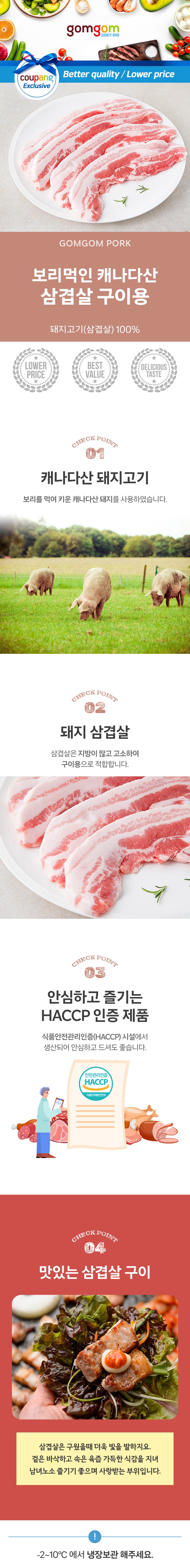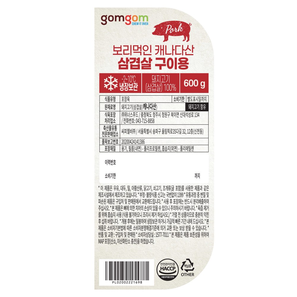 | 품목 또는 명칭 | 곰곰 보리먹인 캐나다산 삼겹살 구이용 | 포장단위별 내용물의 용량(중량),수량,크기 | 600g x 2개,1개 |