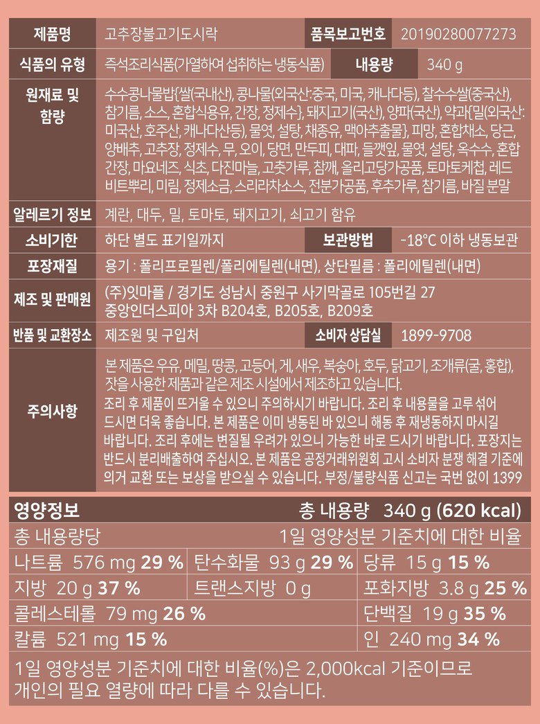 - 섭취방법: 즉석조리식품(가열하여 섭취하는 냉동식품)
