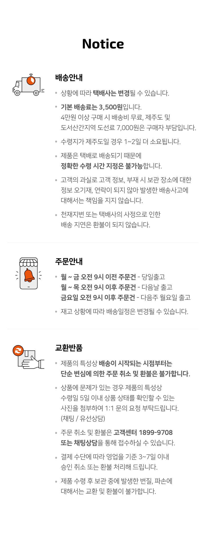 | 배송방법 | 순차배송 | 배송비 | 3,500원 - 40,000원 이상 구매 시 무료배송 - 도서산간 지역 배송불가 |