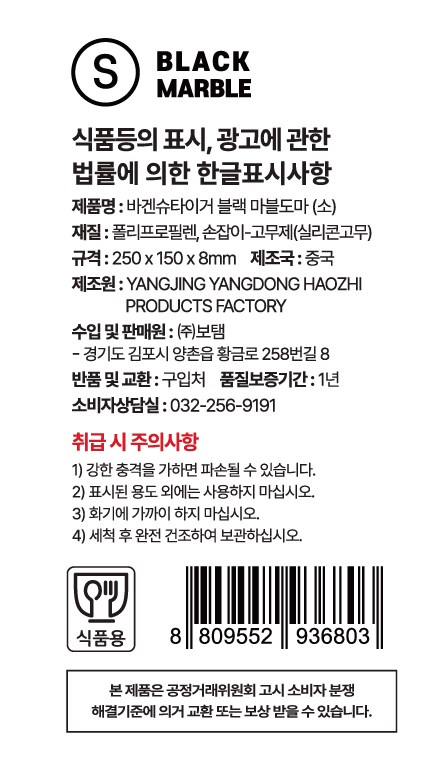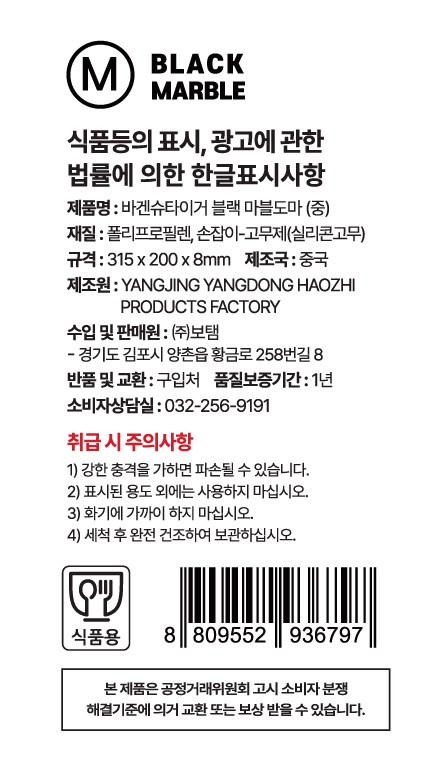 | 품명 및 모델명 | 바겐슈타이거 블랙마블 도마 | 재질 | 컨텐츠 참조 |