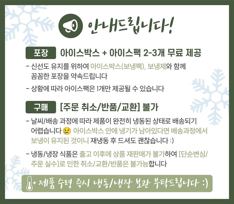| 배송방법 | 신선/냉장/냉동 | 배송비 | 3,500원 · 도서산간 추가 배송비 - 제주 지역: 3,000원 - 도서산간 지역: 3,000원 |