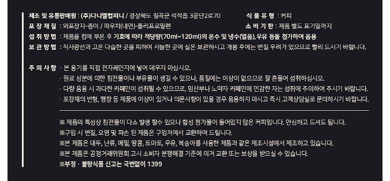 | 생산자 및 소재지 | 상품 상세페이지 참조 | 제조연월일, 소비기한 또는 품질유지기한 | 상품 상세페이지 참조 |