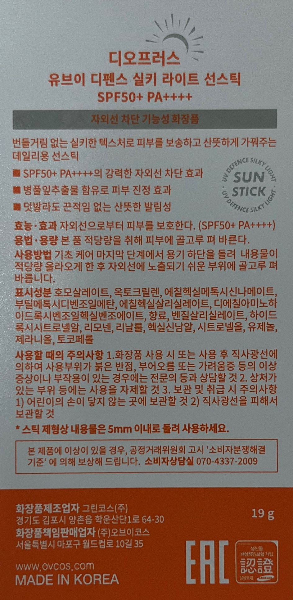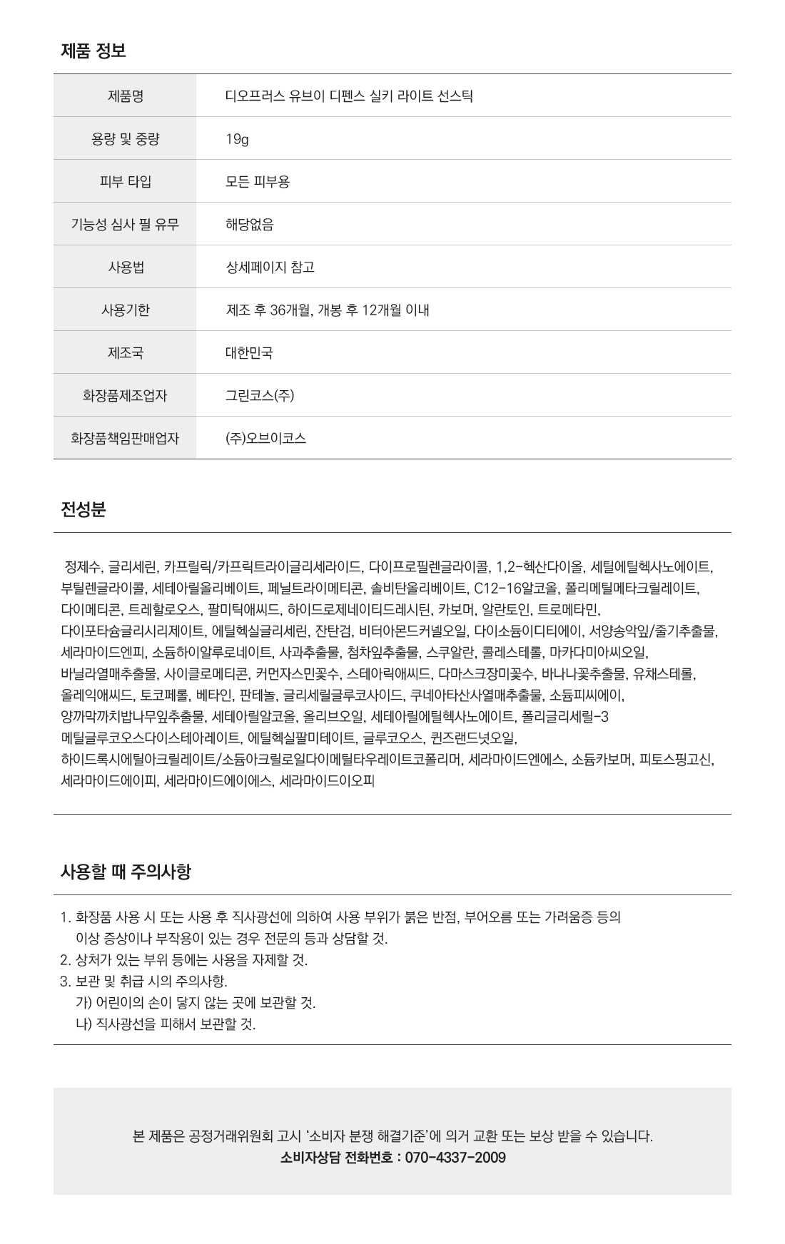 | 화장품제조업자, 화장품책임판매업자 및 맞춤형화장품판매업자 | 그린코스(주) / (주)오브이코스 | 제조국 | 대한민국 |