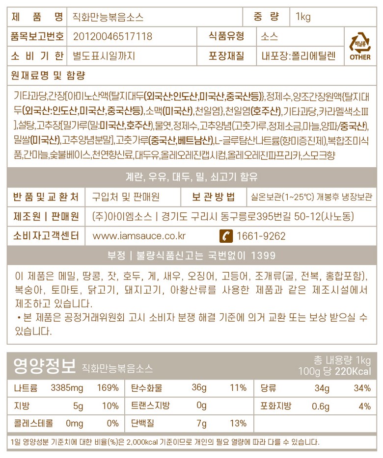 | 포장단위별 내용물의 용량(중량), 수량 | 1kg / 1ea | 원재료명 및 함량 | 기타과당,간장[아미노산액{탈지대두(외국산:인도산,미국산,중국산등)},정제수,양조간장원액{탈지대두(외국산:인도산,미국산,중국산등),소맥(미국산),천일염},천일염(호주산),기타과당,카라멜색소Ⅲ],설탕,고추장[밀가루(밀:미국산,호주산),물엿,정제수,고추양념(고춧가루,정제소금,마늘,양파/중국산),밀쌀(미국산),고추양념분말],고춧가루(중국산,베트남산),L-글루탐산나트륨(향미증진제),복합조미식품,간마늘,숯불베이스,천연향신료,대두유,올레오레진캡시컴,올레오레진파프리카,스모크향 |