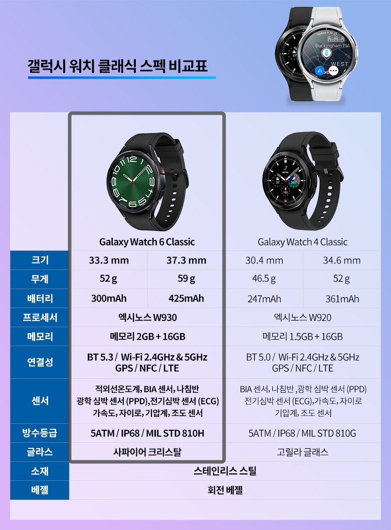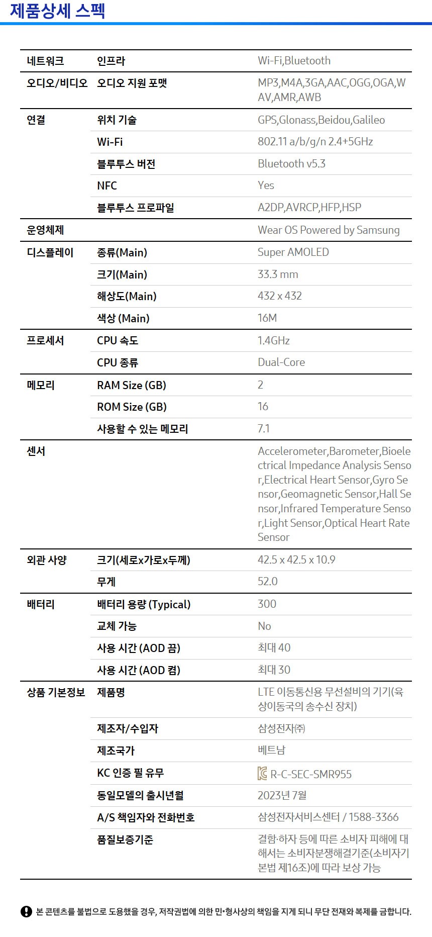 | 품명 및 모델명 | 갤럭시워치6 / SM-R950N | KC 인증정보 | 본품 : R-C-SEC-SMR955, 유/KC마크, 전지 : YU101617-23004 |