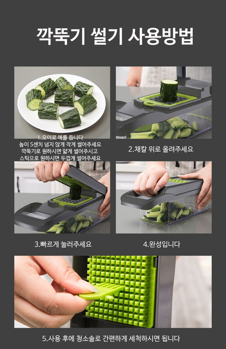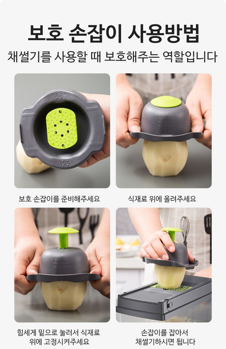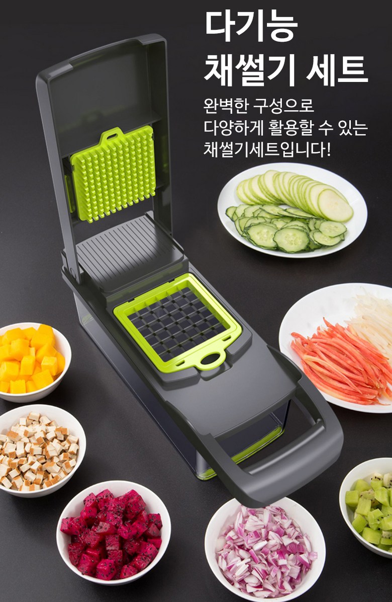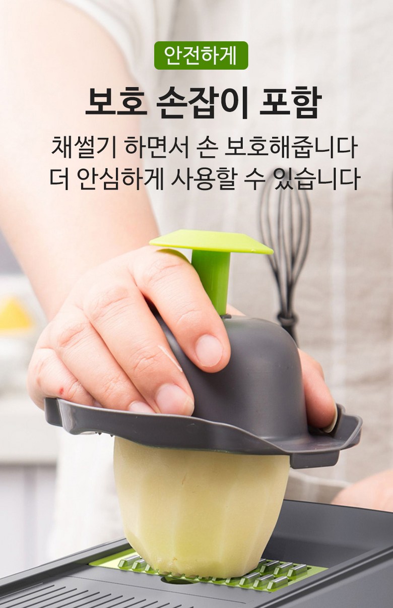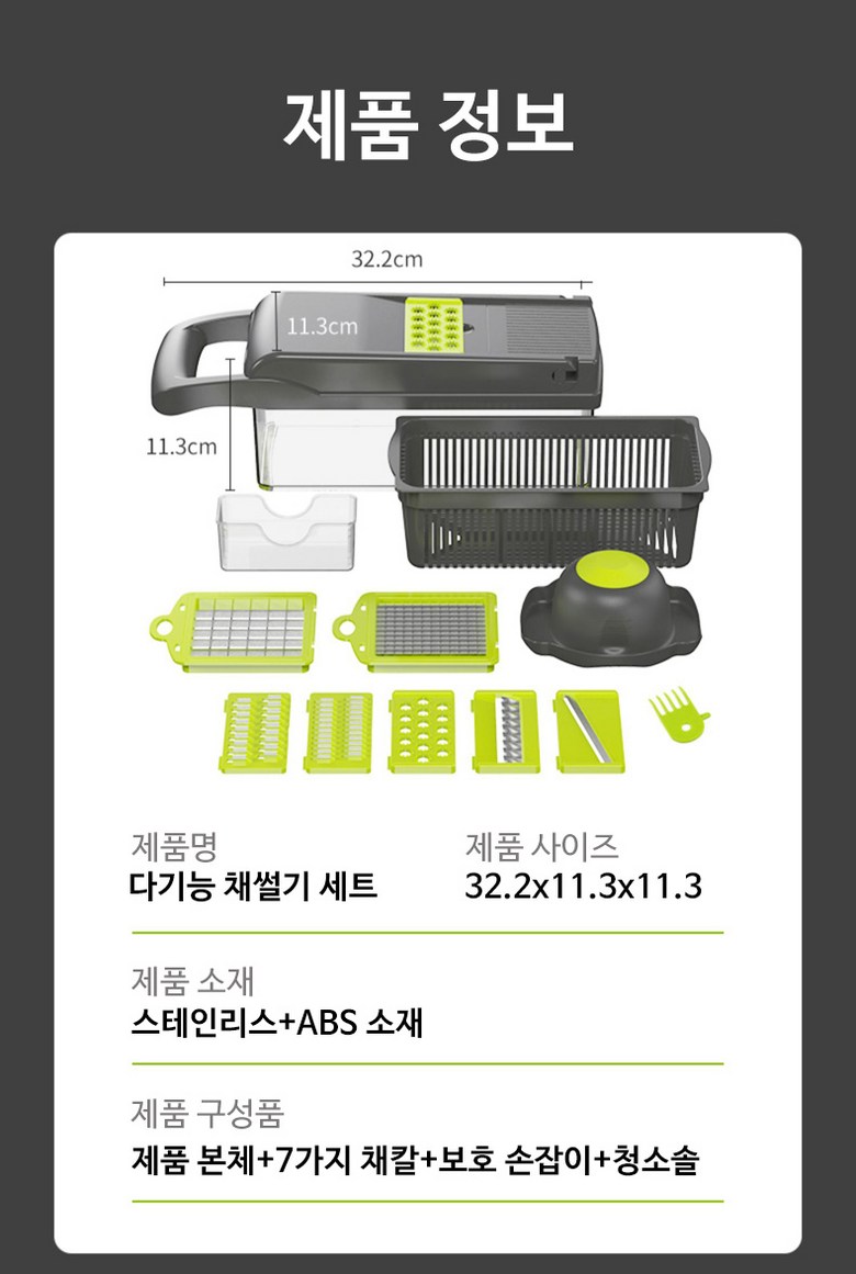 | 구성품 | 제품 본체+7가지 채칼+보호 손잡이+청소솔 | 크기 | 13*22*12cm |