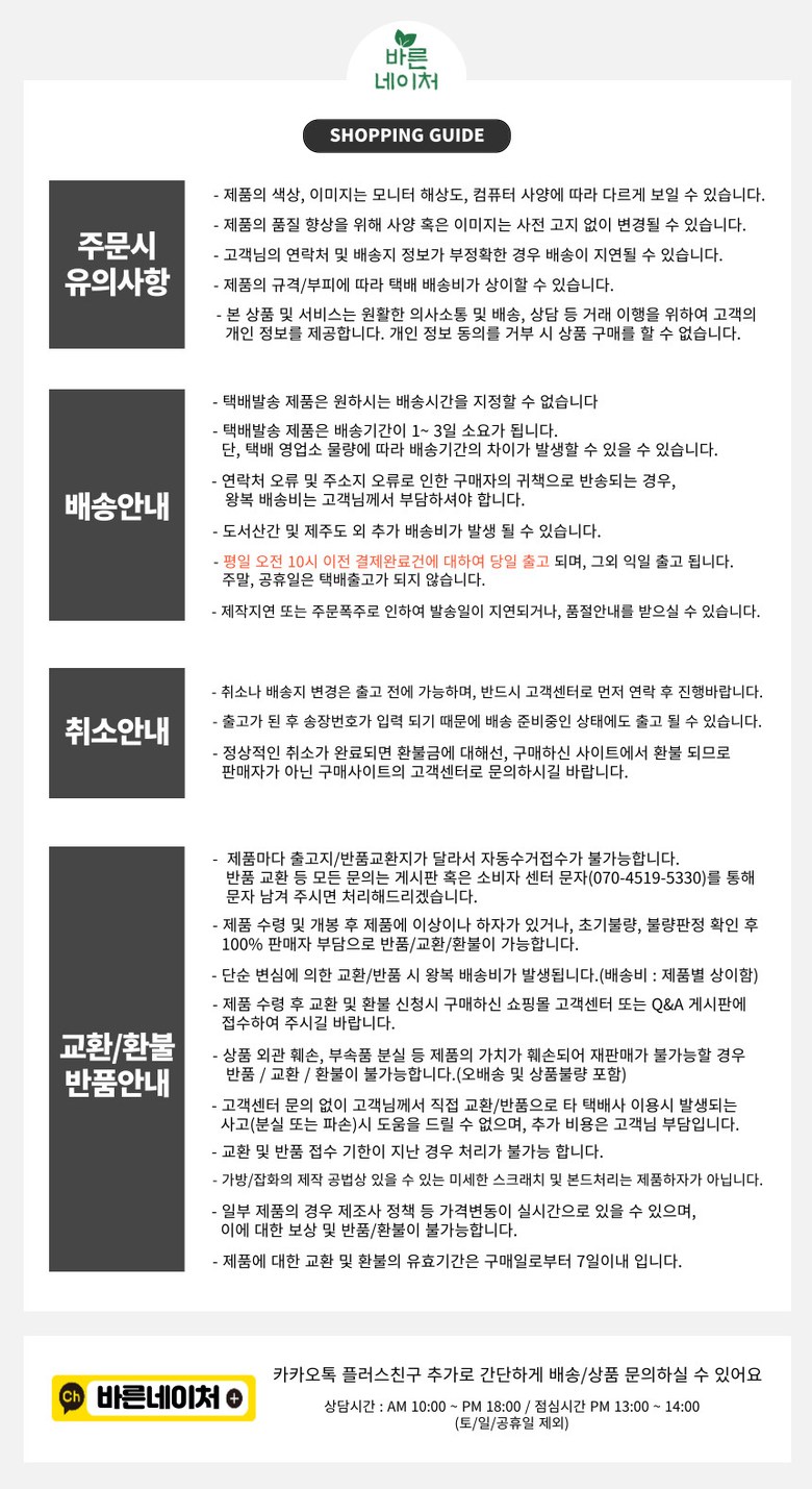 - ㆍ모니터 해상도의 차이로 인해 색상이나 이미지가 실제와 달라, 고객이 단순 변심으로 교환/반품을 무료로 요청하는 경우