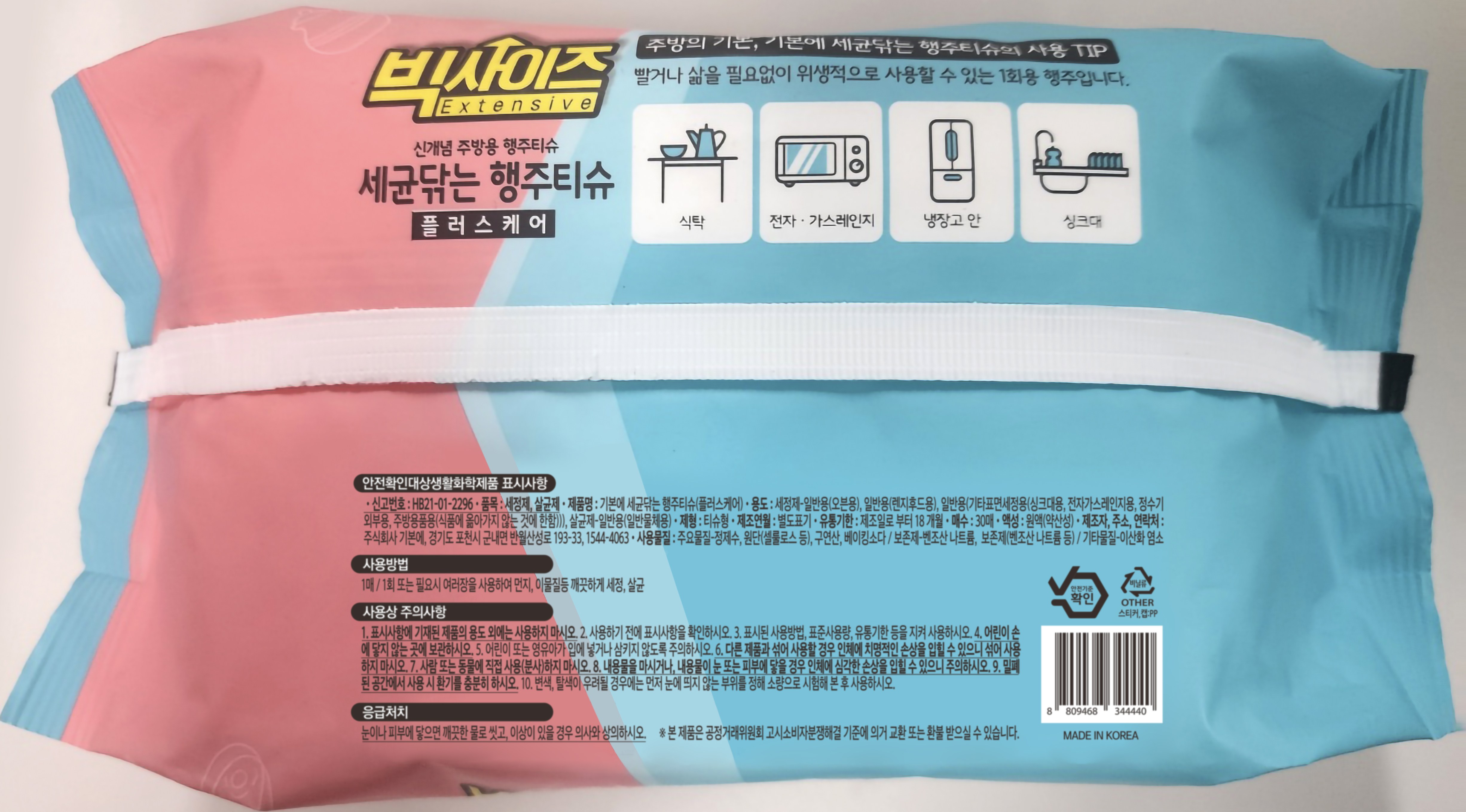 | 품목 및 제품명 | 세정제,살균제 / 기본에 세균닦는 행주티슈(플러스케어) | 용도(표백제의 경우 계열을 함께표시) 및 제형 | 일반용-오븐용,일반용-렌지후드용,일반용-기타표면세정용-싱크대용,전자가스레인지용,정부기외부용,주방용품용(식품에 옮아가지 않는 것에 한함),일반용-일반물체용 / 비분사형-티슈형 |