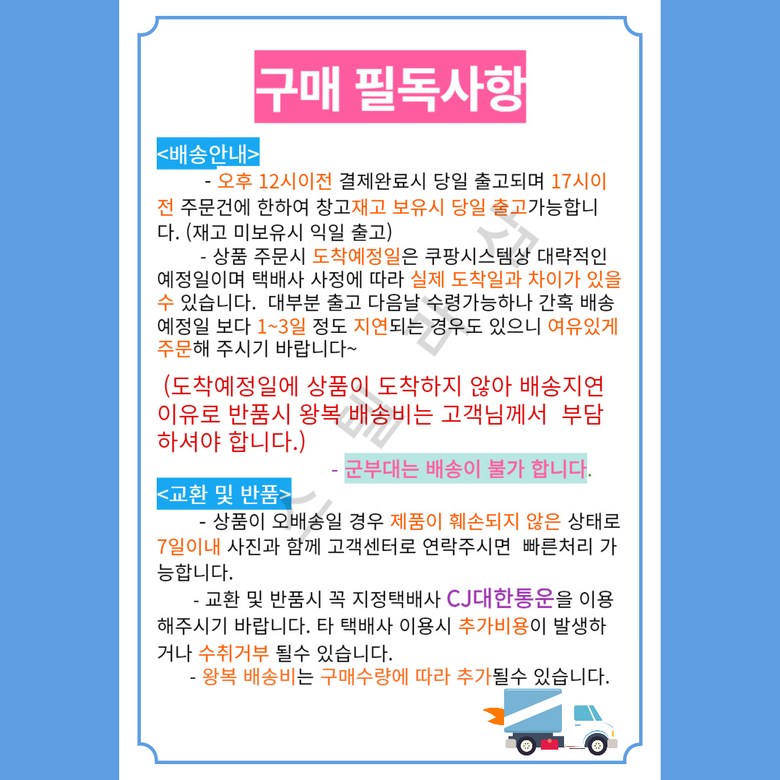 - ㆍ교환/반품에 관한 일반적인 사항은 판매자가 제시사항보다 관계법령이 우선합니다.