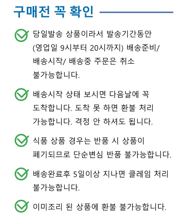- ㆍ교환/반품에 관한 일반적인 사항은 판매자가 제시사항보다 관계법령이 우선합니다.