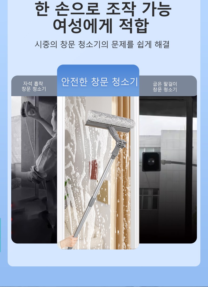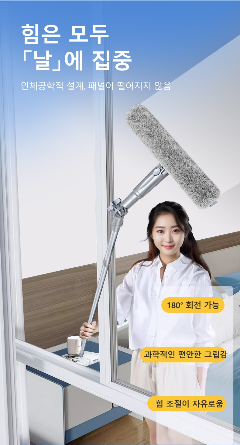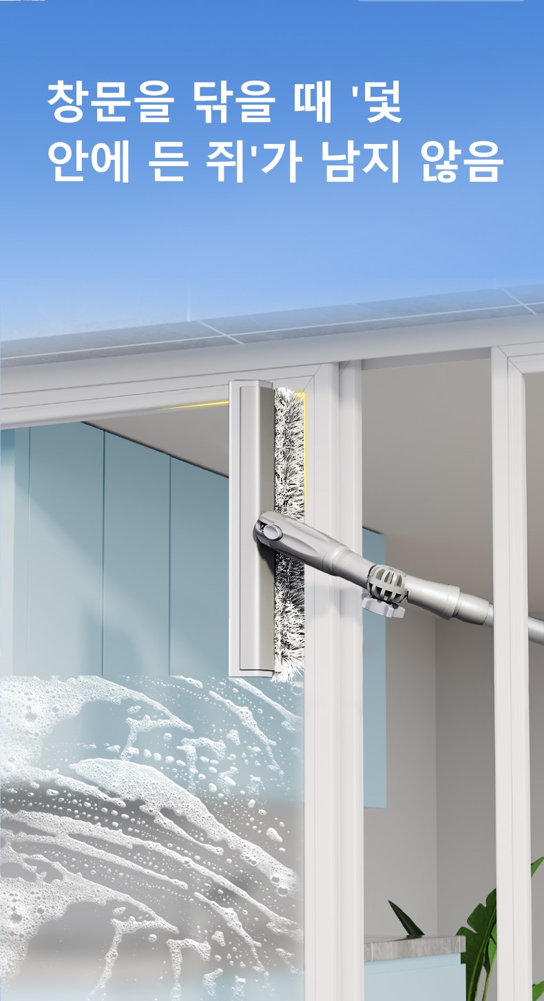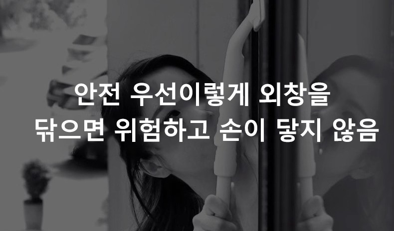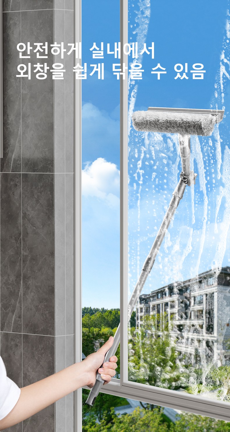 자유자재 회전형 헤드입니다. 팔 모양을 본 뜬 구조로 360˚ 유연하게 회전하여 창문의 구석구석까지 손쉽게 청소할 수 있습니다. 고층 창문도 실내에서 안전하게 창밖까지 깨끗하게 청소 가능합니다. 안전하게 다양한 공간에서 사용할 수 있습니다. 기존 창문 청소 시 발생하던 충돌, 파손 위험이 최소화되었으며 안심하고 사용할 수 있습니다. 유리창 안팎, 대형 거울 등 다양한 표면에서 사용할 수 있습니다.