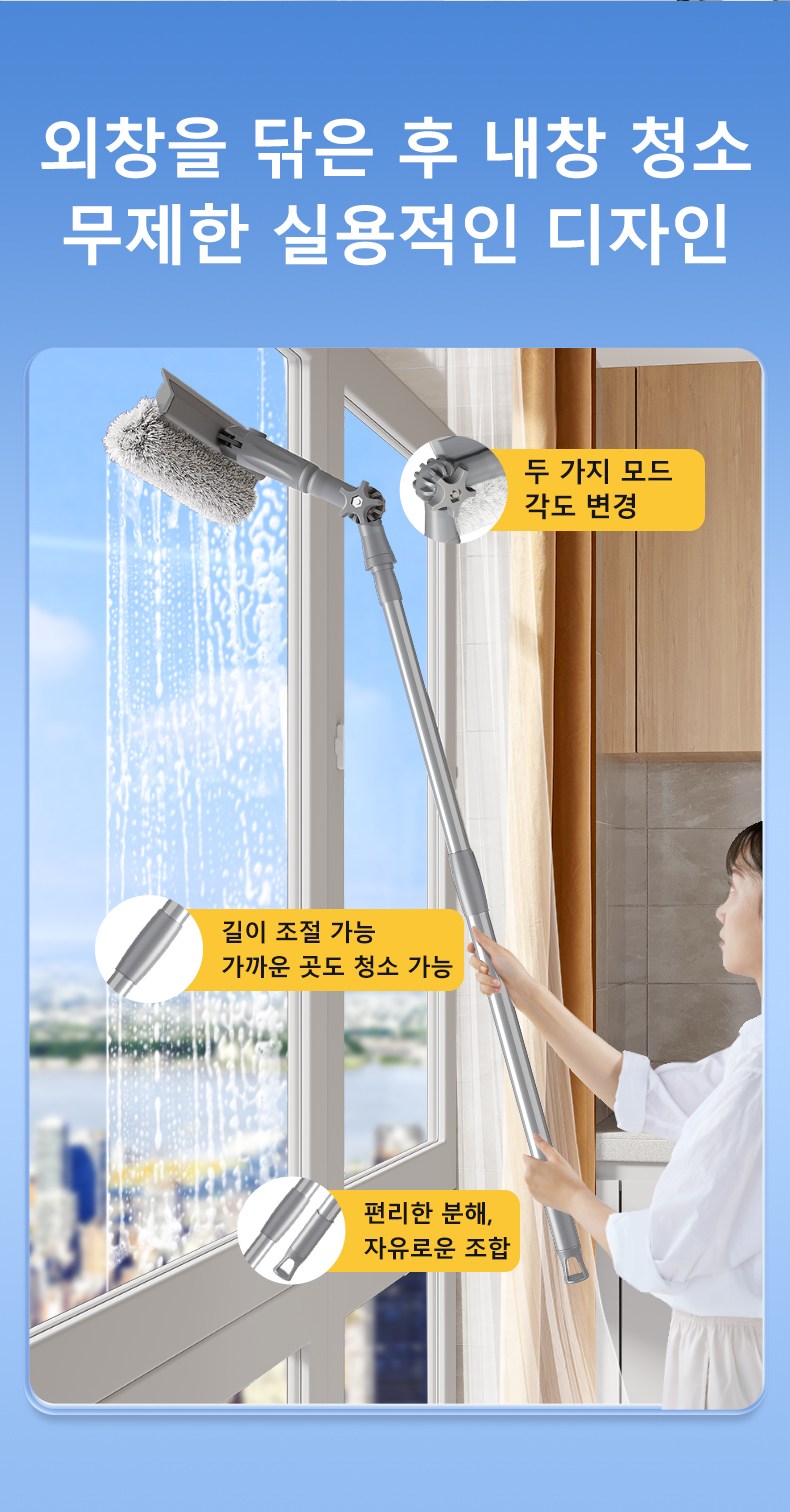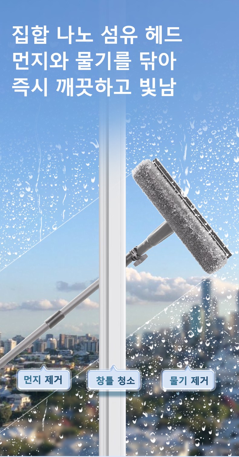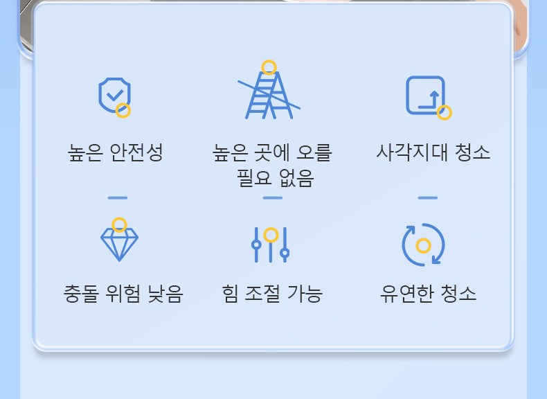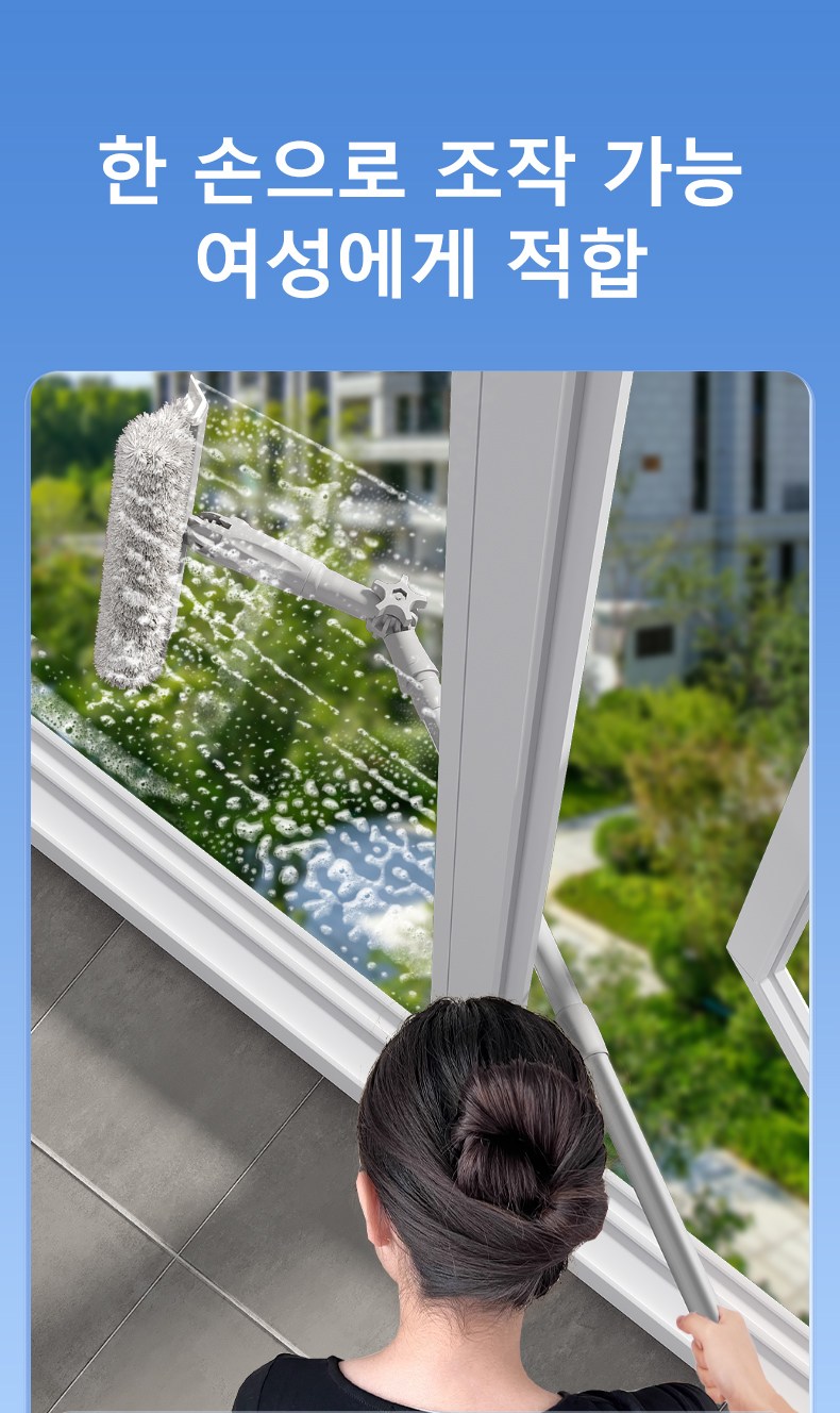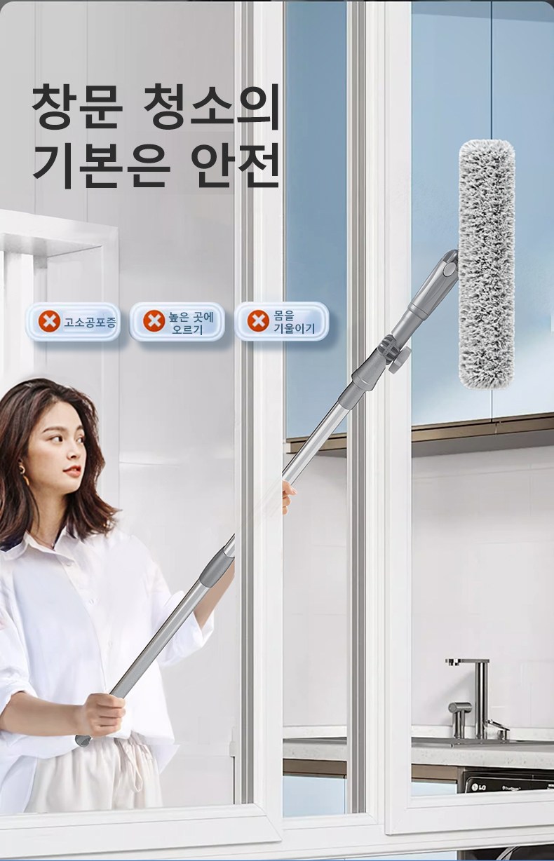 자유자재 회전형 헤드입니다. 팔 모양을 본 뜬 구조로 360˚ 유연하게 회전하여 창문의 구석구석까지 손쉽게 청소할 수 있습니다. 고층 창문도 실내에서 안전하게 창밖까지 깨끗하게 청소 가능합니다. 안전하게 다양한 공간에서 사용할 수 있습니다. 기존 창문 청소 시 발생하던 충돌, 파손 위험이 최소화되었으며 안심하고 사용할 수 있습니다. 유리창 안팎, 대형 거울 등 다양한 표면에서 사용할 수 있습니다.