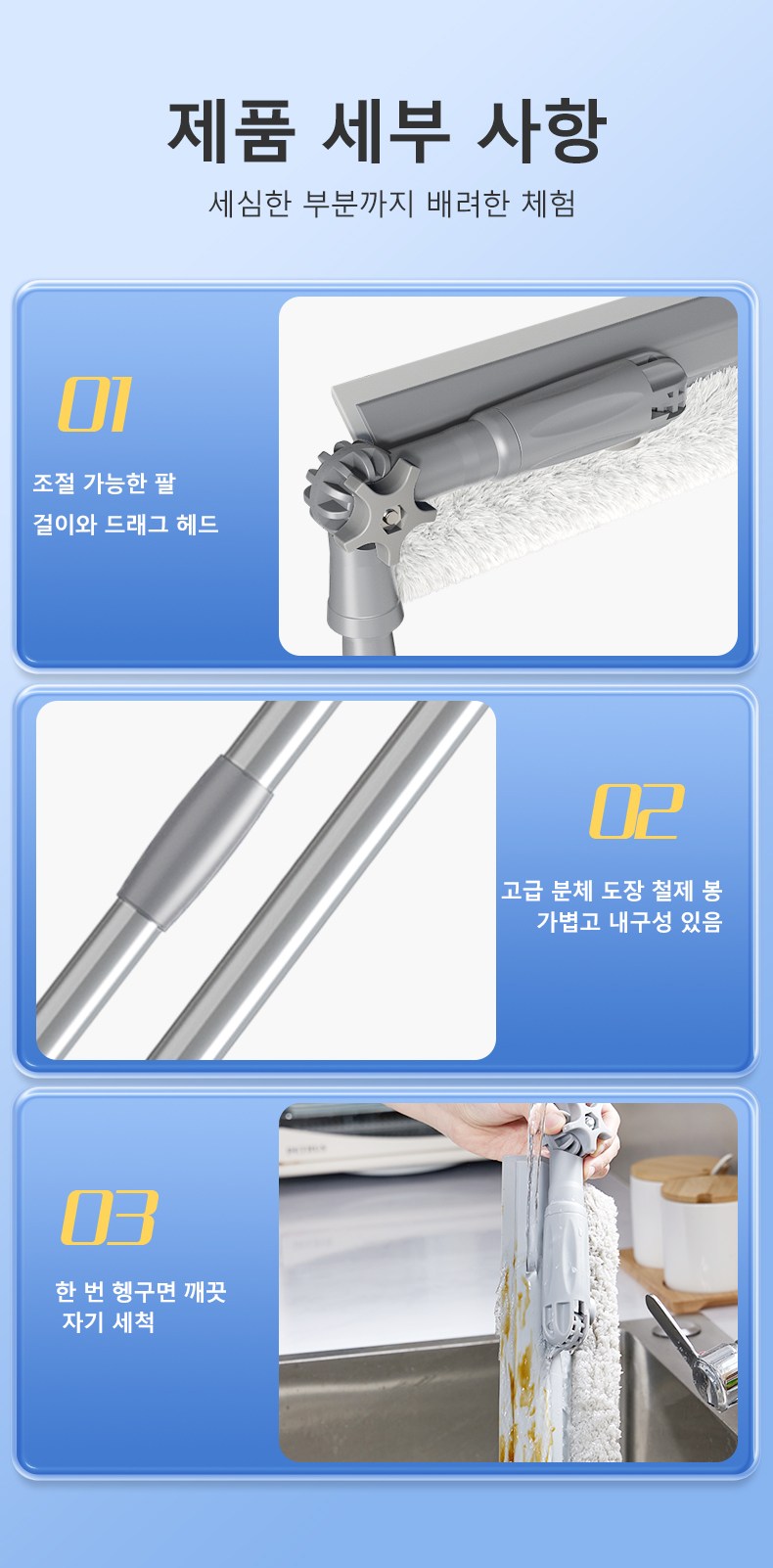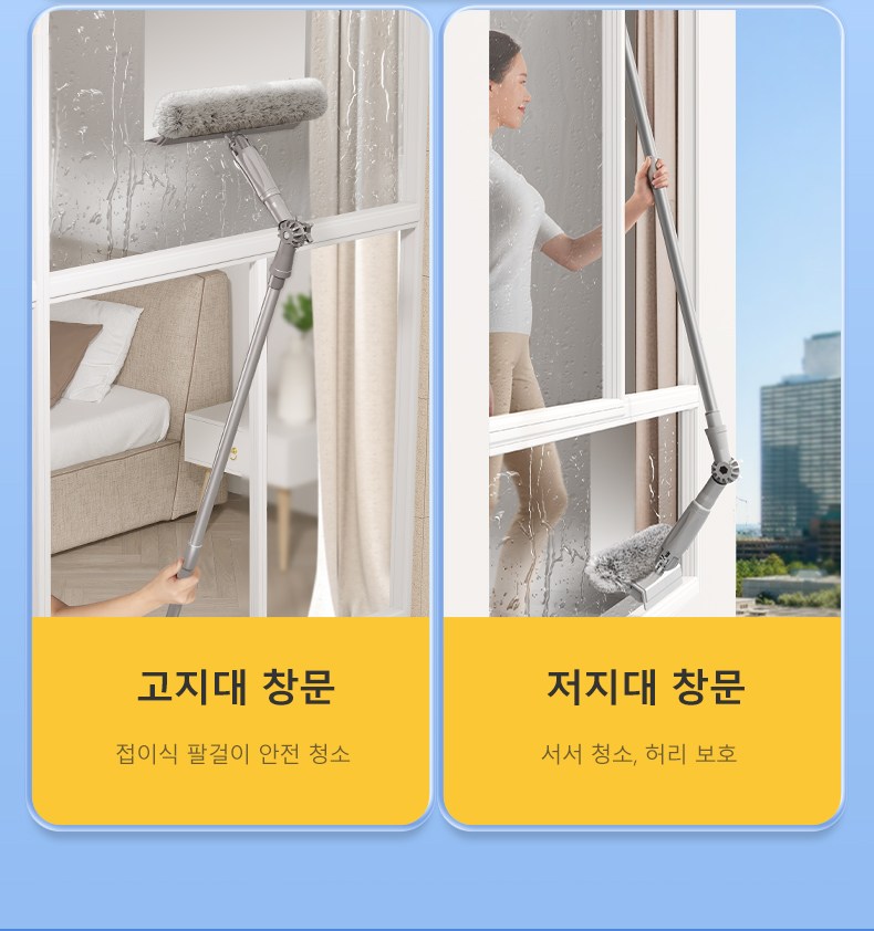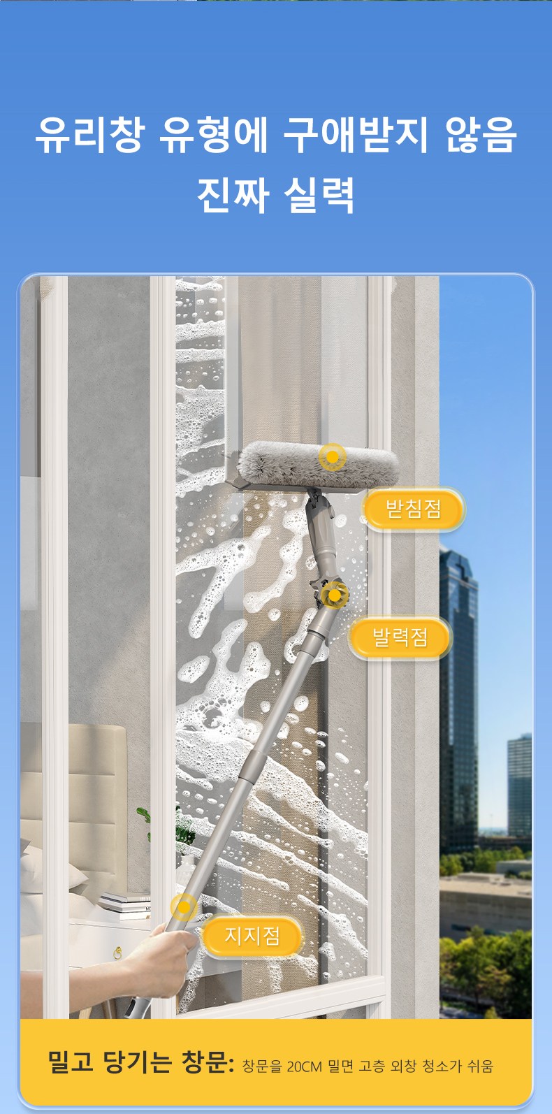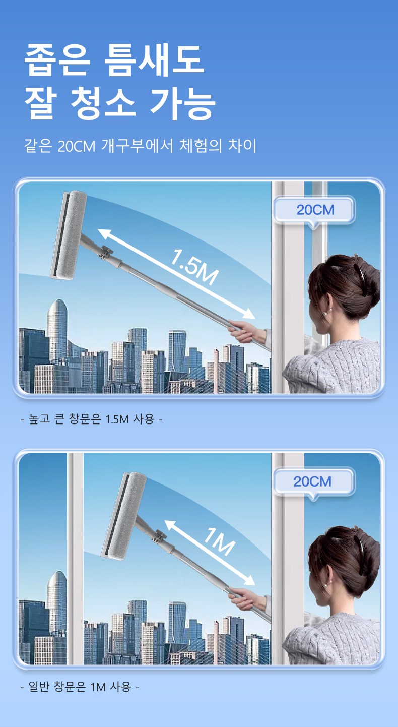 자유자재 회전형 헤드입니다. 팔 모양을 본 뜬 구조로 360˚ 유연하게 회전하여 창문의 구석구석까지 손쉽게 청소할 수 있습니다. 고층 창문도 실내에서 안전하게 창밖까지 깨끗하게 청소 가능합니다. 안전하게 다양한 공간에서 사용할 수 있습니다. 기존 창문 청소 시 발생하던 충돌, 파손 위험이 최소화되었으며 안심하고 사용할 수 있습니다. 유리창 안팎, 대형 거울 등 다양한 표면에서 사용할 수 있습니다.