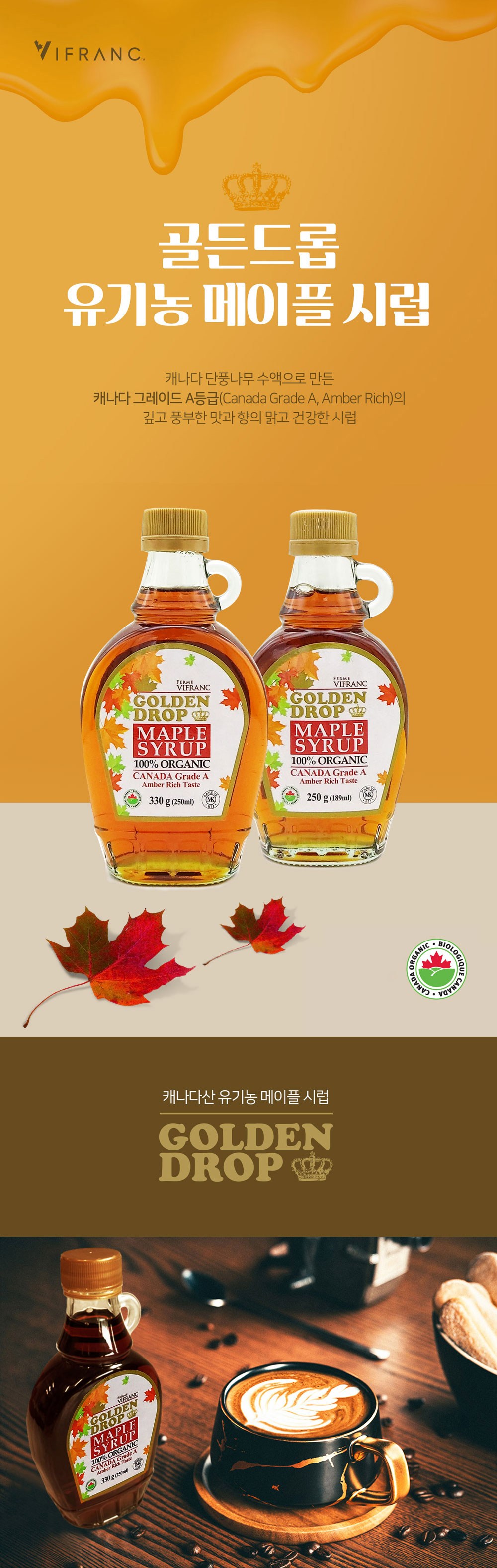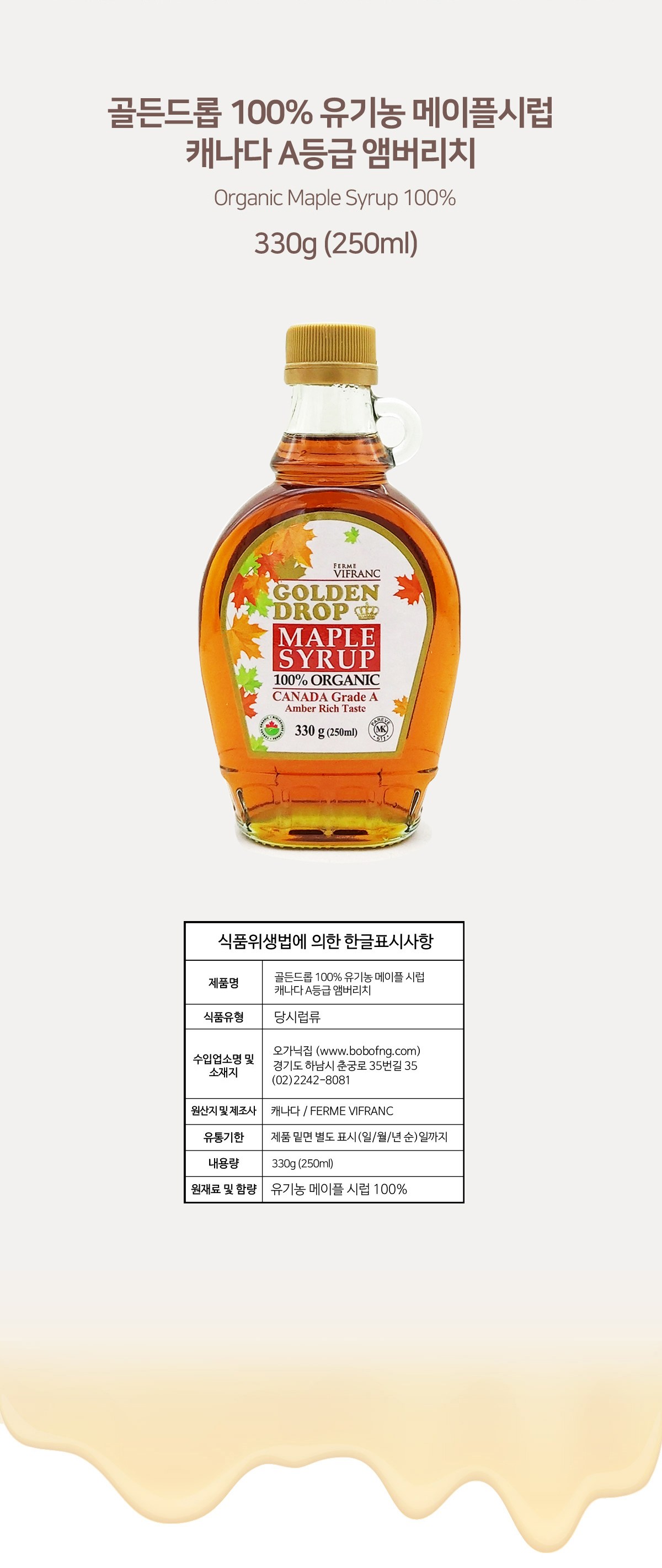 | 제품명 | 골든드롭 100% 유기농 메이플시럽 캐나다 A등급 앰버리치 | 식품의 유형 | 당시럽류 |
