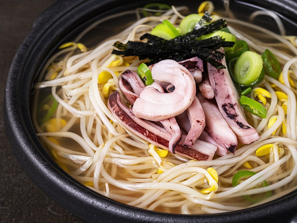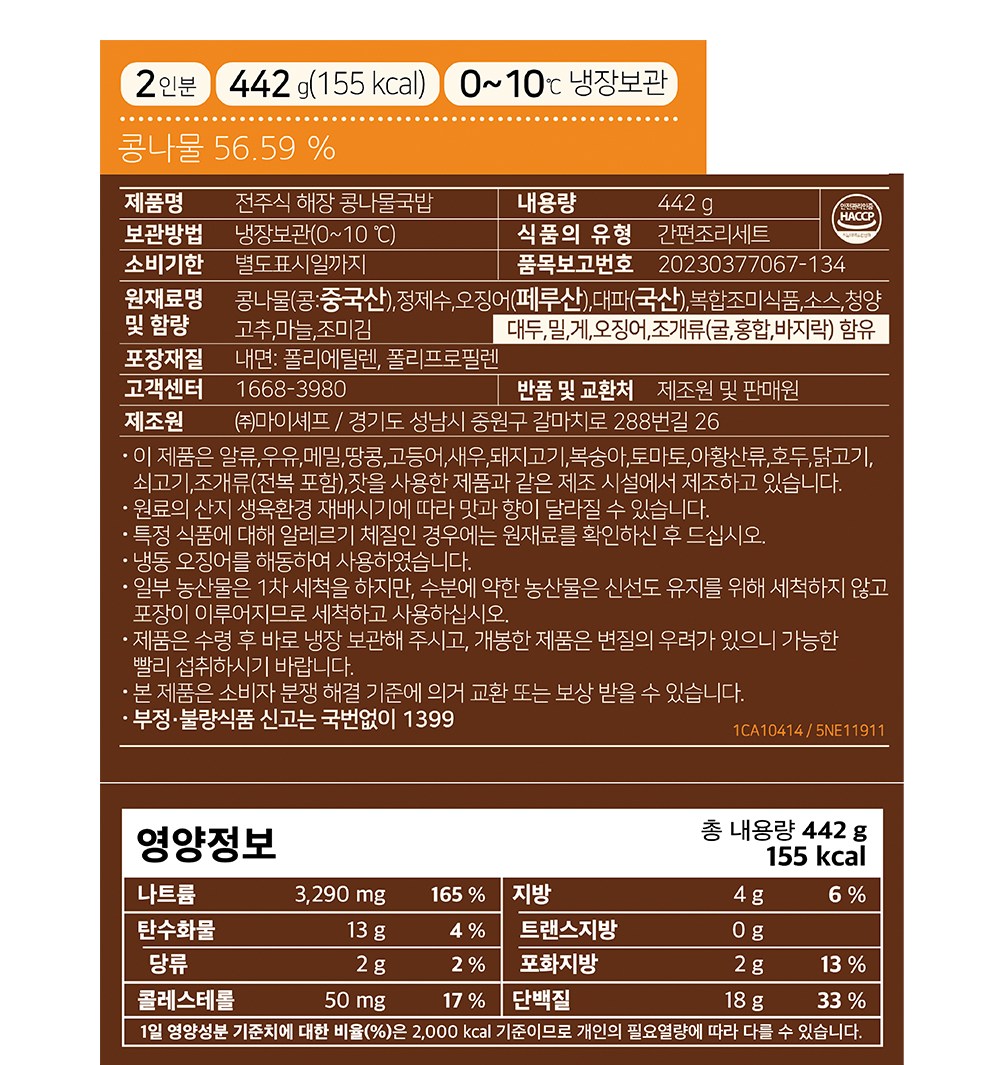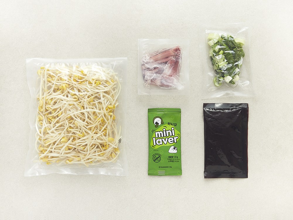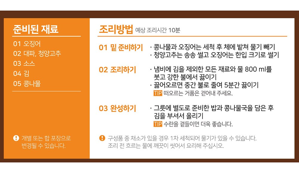 콩나물, 오징어, 청양고추, 대파, 소스, 김으로 구성되어 있습니다.