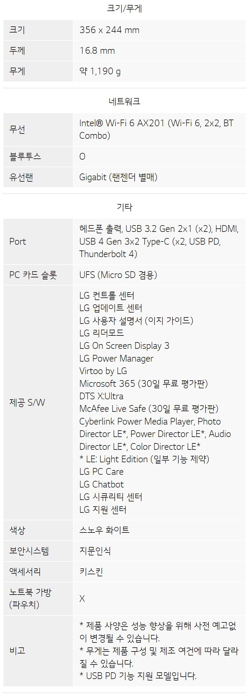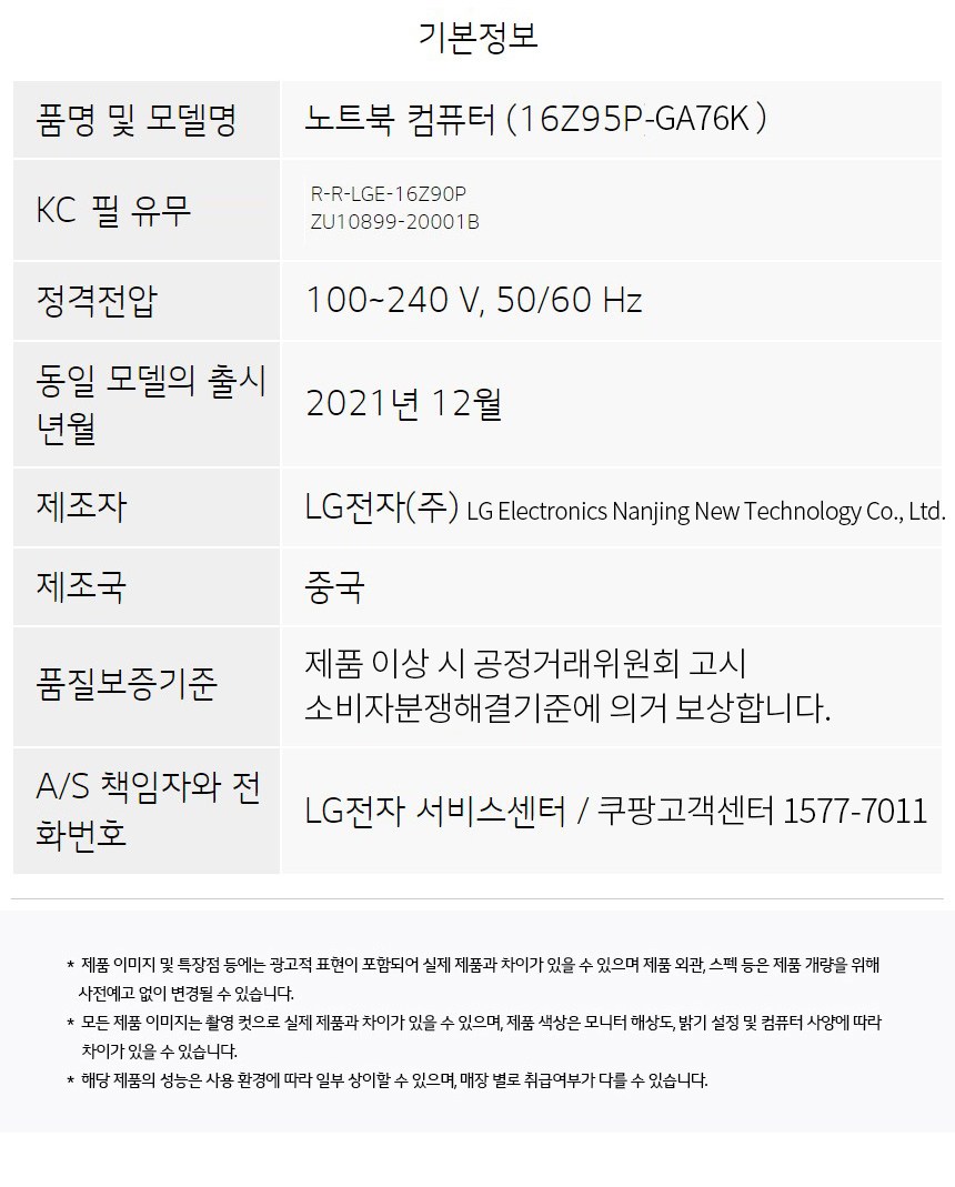 | 품명 및 모델명 | 노트북 컴퓨터 / 16Z95P-GA76K | KC 인증정보 | 본품: ZU10899-20001B, R-R-LGE-16Z90P / 어댑터 : HU10967-20029A / 내장 배터리 : YU10148-19011 |