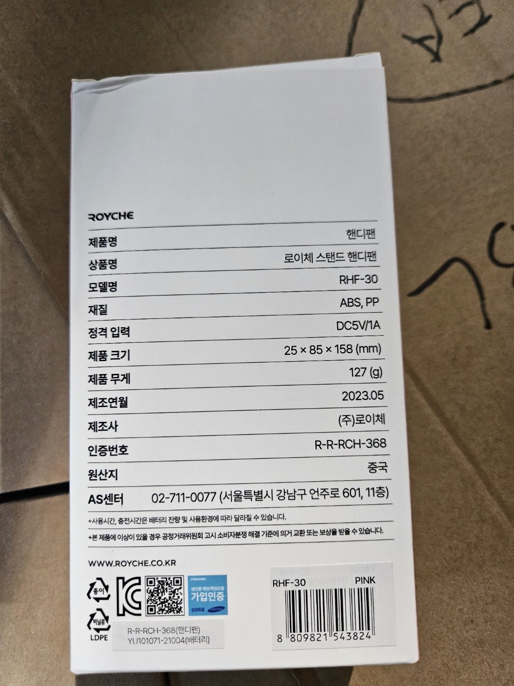 | 품명 및 모델명 | 로이체 스탠드 듀얼 모터 휴대용 미니 핸디 선풍기/ RHF-30 | KC 인증정보 | 본품: R-R-RCH-368, 전지: YU101071-21004 |