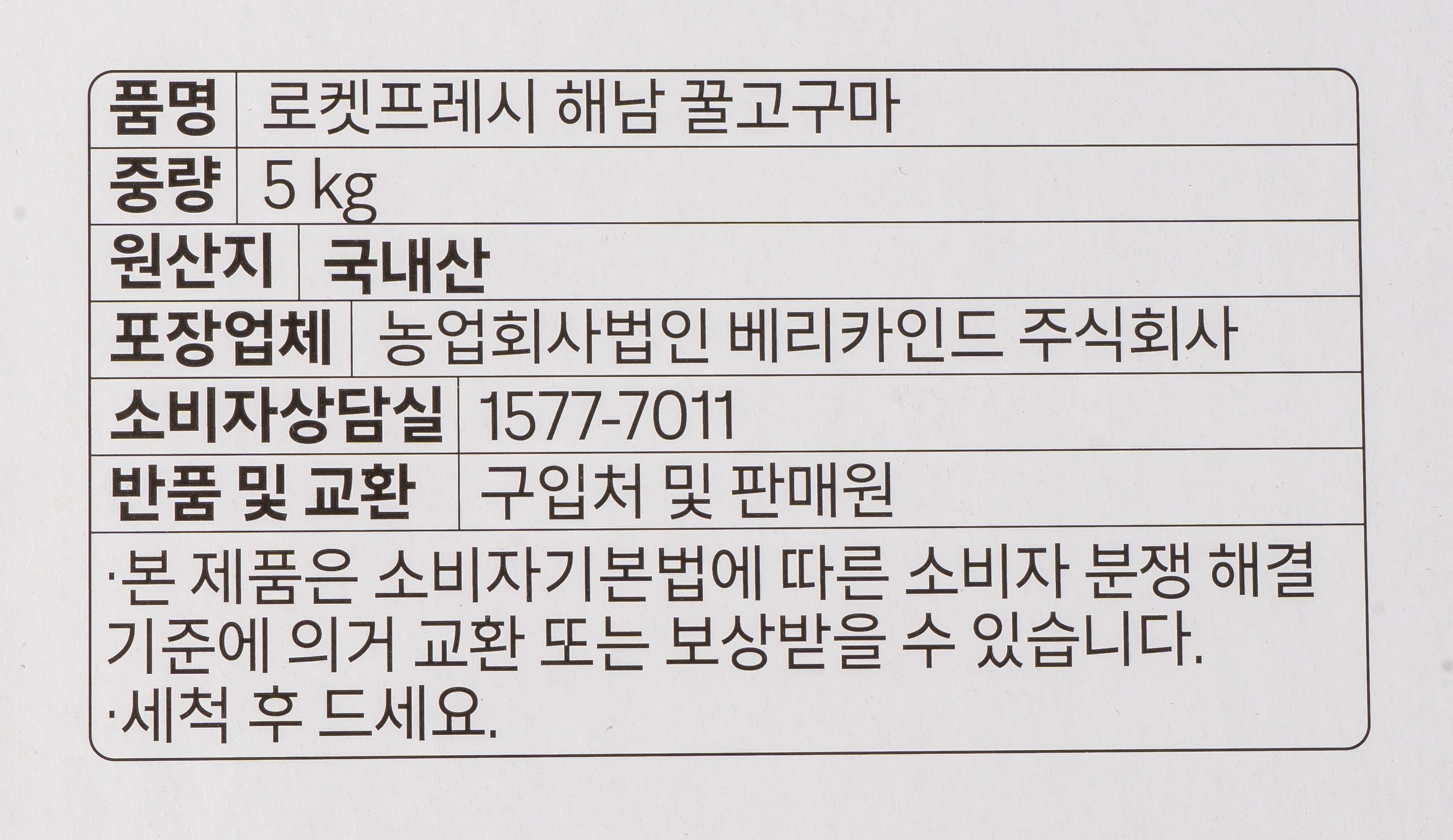 | 품목 또는 명칭 | 해남 꿀고구마 | 포장단위별 내용물의 용량(중량),수량,크기 | 5kg x 1개 |