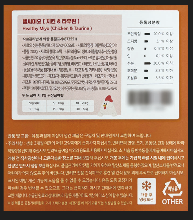 | 품명 및 모델명 | 헬씨미요 [치킨 & 타우린] | 인증/허가 사항 | 사료관리법에 따른 성분등록번호: 컨텐츠참조 |