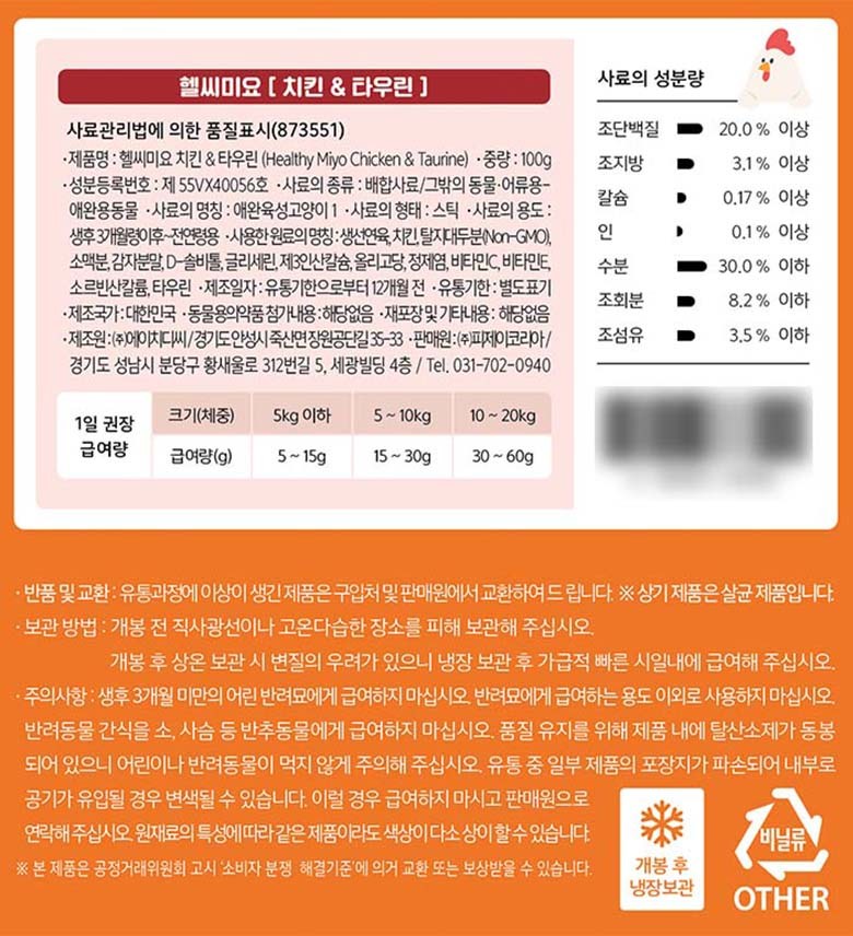 | 품명 및 모델명 | 헬씨미요 치킨&타우린 | 인증/허가 사항 | 사료관리법에 따른 성분등록번호 : 컨텐츠 참조 |
