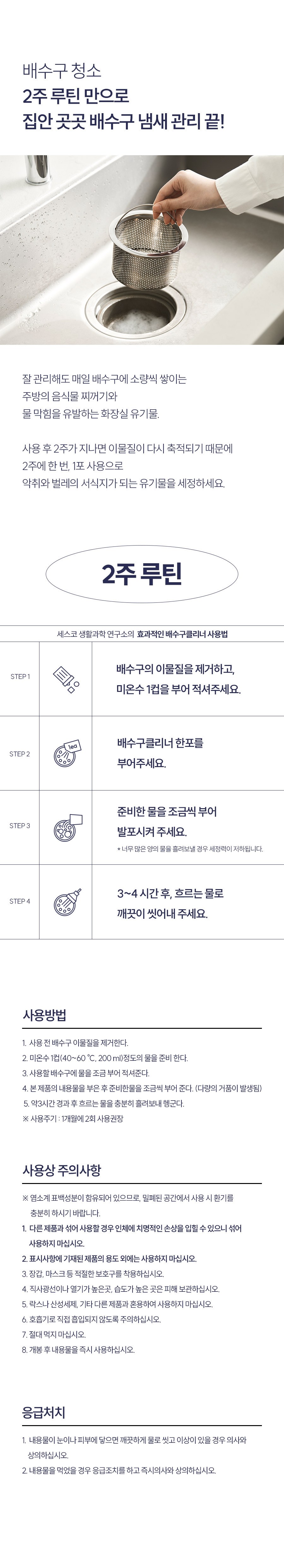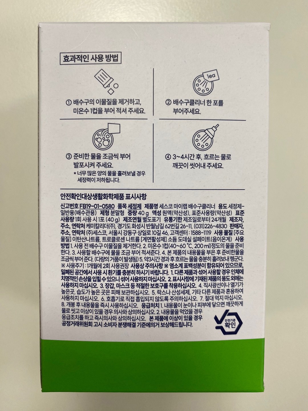 | 품목 및 제품명 | 세정제/세스코 마이랩 배수구 클리너 | 용도(표백제의 경우 계열을 함께표시) 및 제형 | 세정제-일반용(배수관용)/분말형 |