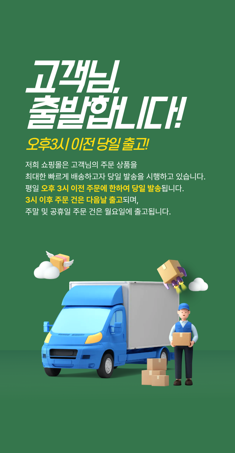 | 배송기간 | ㆍ도서산간 지역 등은 배송에 3-5일이 더 소요될 수 있습니다. - 천재지변, 물량 수급 변동 등 예외적인 사유 발생 시, 다소 지연될 수 있는 점 양해 부탁드립니다. | ||