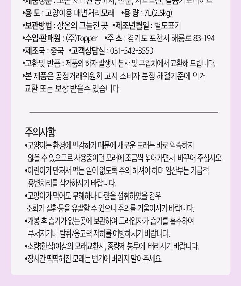| 품명 및 모델명 | 테비 두부두부 시그니처 고양이모래 | 인증/허가 사항 | 해당사항없음 |