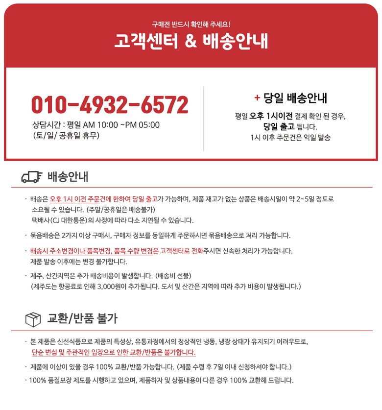 | 배송방법 | 신선/냉장/냉동 | 배송비 | 무료배송 · 도서산간 추가 배송비 - 제주 지역: 5,000원 - 도서산간 지역: 5,000원 |