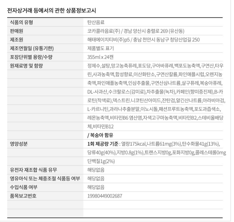 | 생산자 및 소재지 | 상품 상세페이지 참조 | 제조연월일, 소비기한 또는 품질유지기한 | 상품 상세페이지 참조 |