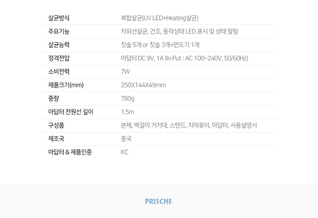| 품명 및 모델명 | 프리쉐 칫솔살균기 / PA-TS1000 | KC 인증정보 | 본품 : MSIP-REM-prs-PA-TS3000, 아답터 : SU10578-21003 , R-R-GKD-DZ007AHL050 |