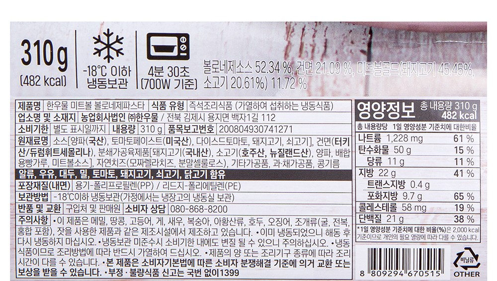고소한 풍미가 좋은 미트볼 볼로네제 파스타예요. 탱글탱글한 면발과 새콤한 소스가 어우러져 조화로운 맛을 선사하죠. 치즈가 솔솔 뿌려져 먹음직스럽답니다. 전자레인지로 손쉽게 조리해 맛깔난 한 끼를 즐겨보세요.