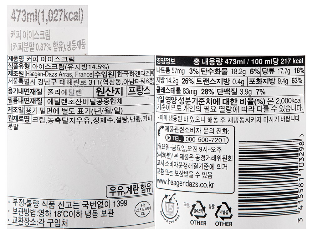 | 포장단위별 내용물의 용량(중량), 수량 | 473ml x 2개,1개 | 원재료명 및 함량 | 컨텐츠 참조 |