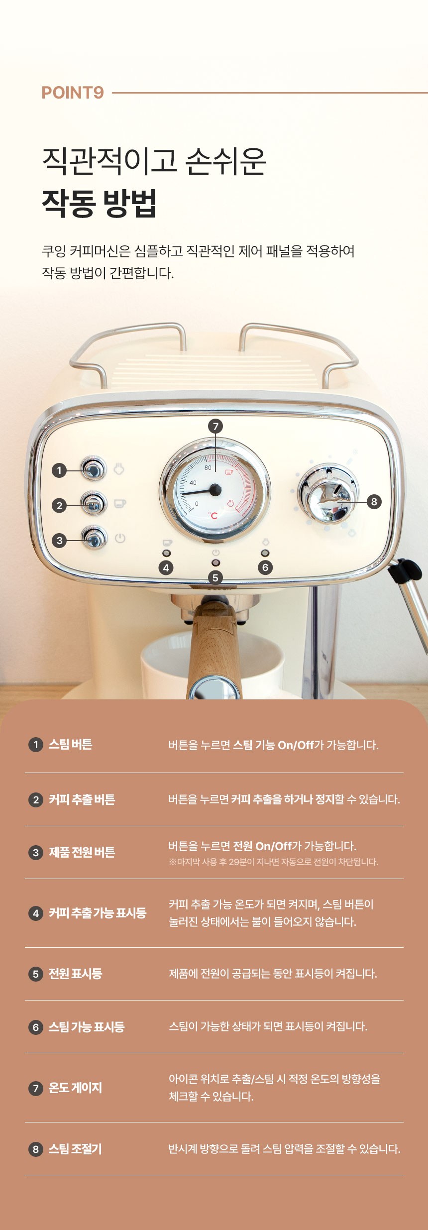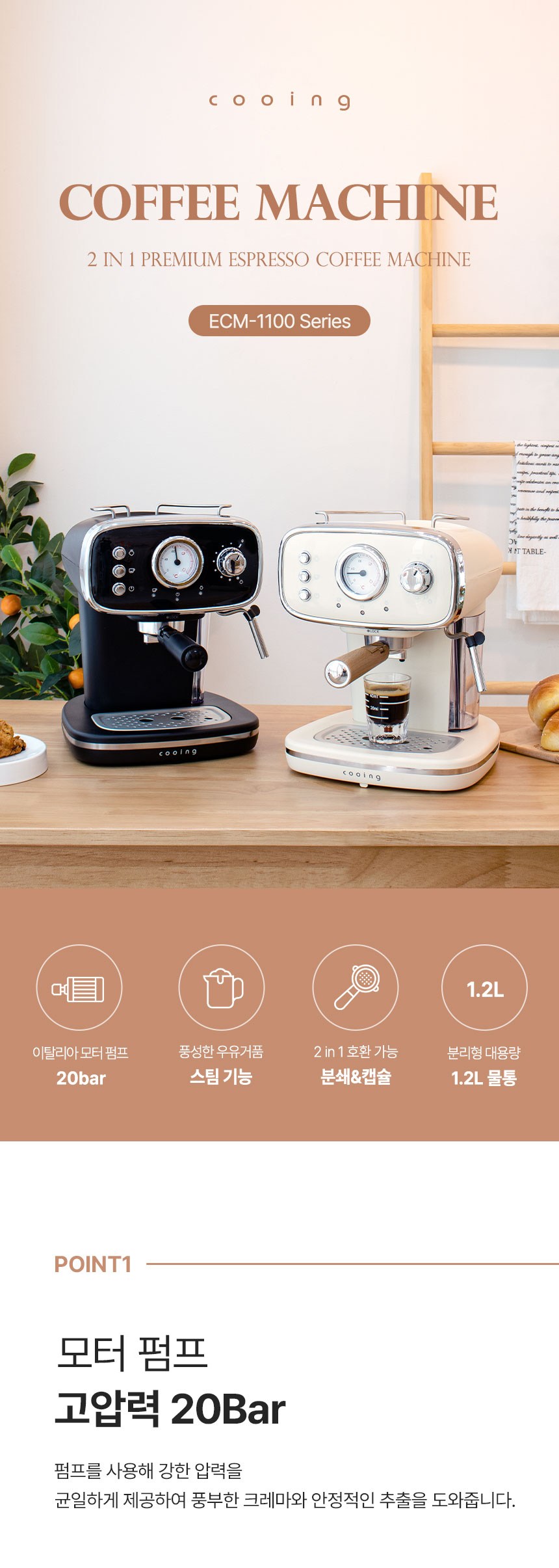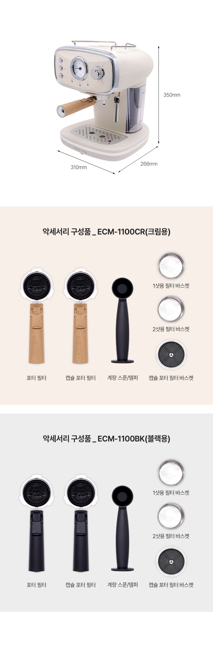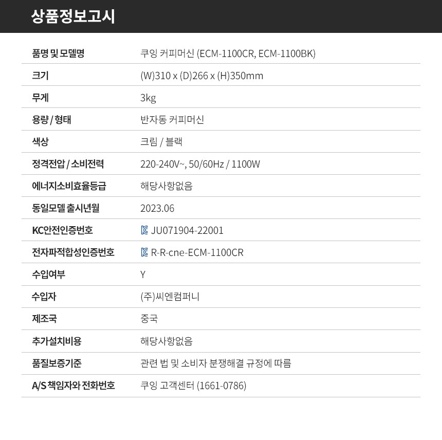 | 품명 및 모델명 | 쿠잉 레트로 커피머신 / ECM-1100BK | KC 인증정보 | JU071904-22001, R-R-cne-ECM-1100CR |