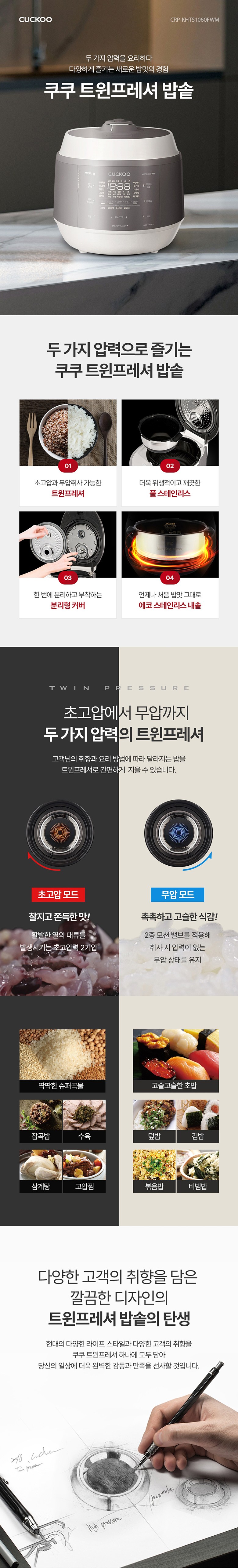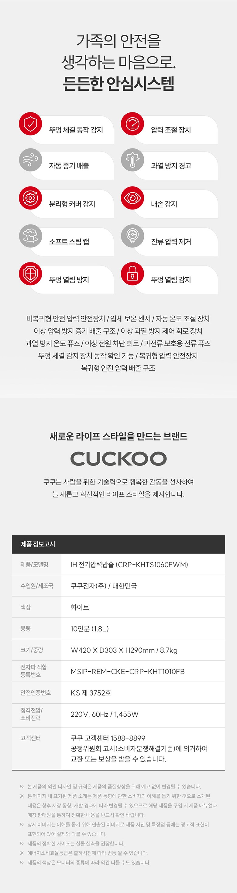 | 품명 및 모델명 | 쿠쿠 트윈프레셔 IH전기압력밥솥 / CRP-KHTS1060FWM | KC 인증정보 | KS C 9310 제3752호, MSIP-REM-CKE-CRP-KHT1010FB,JM07016-23005A |