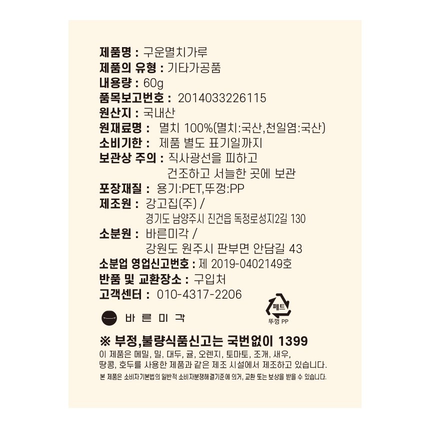 | 제품명 | 구운 멸치가루 | 식품의 유형 | 컨텐츠 참조 |