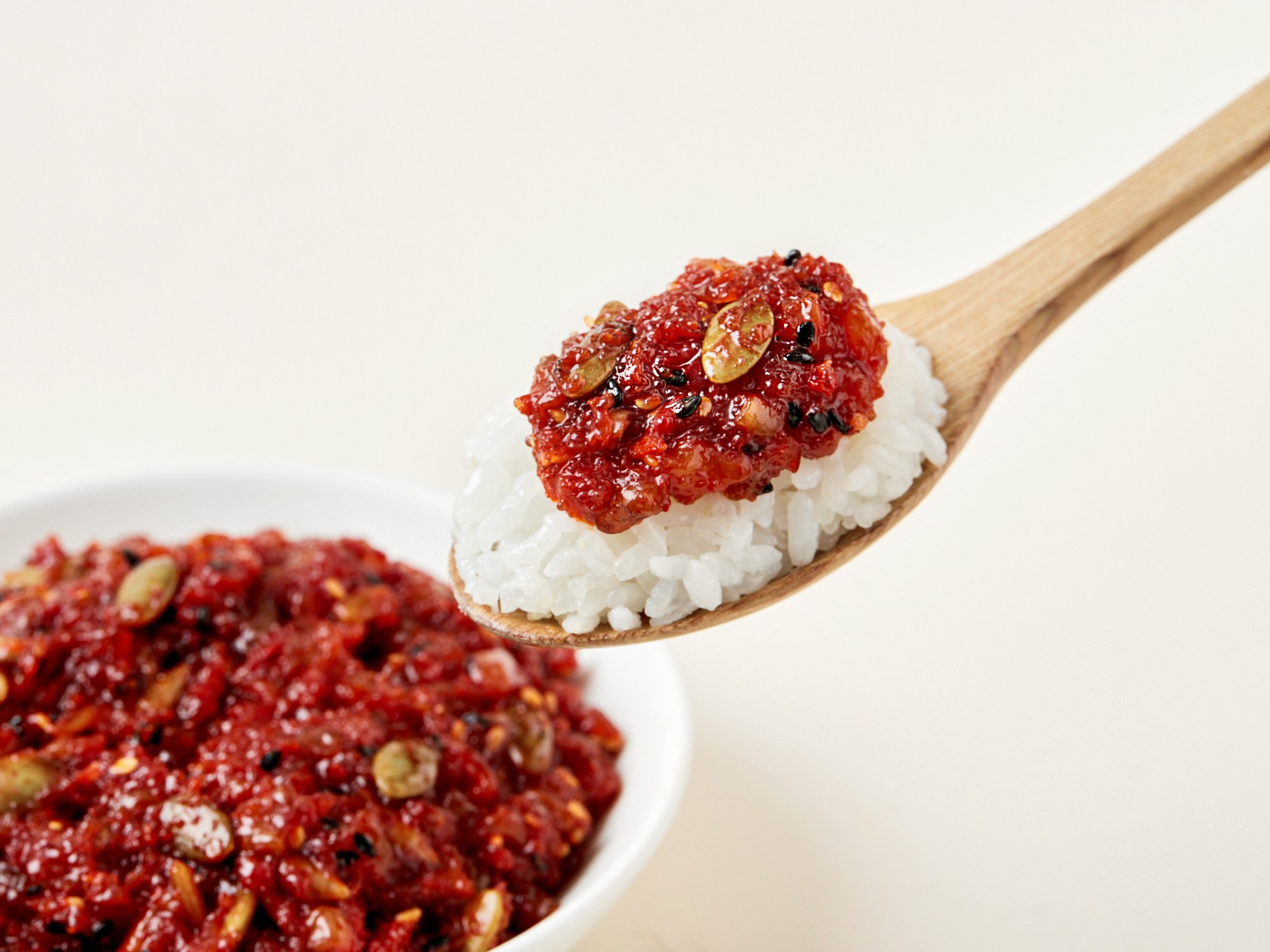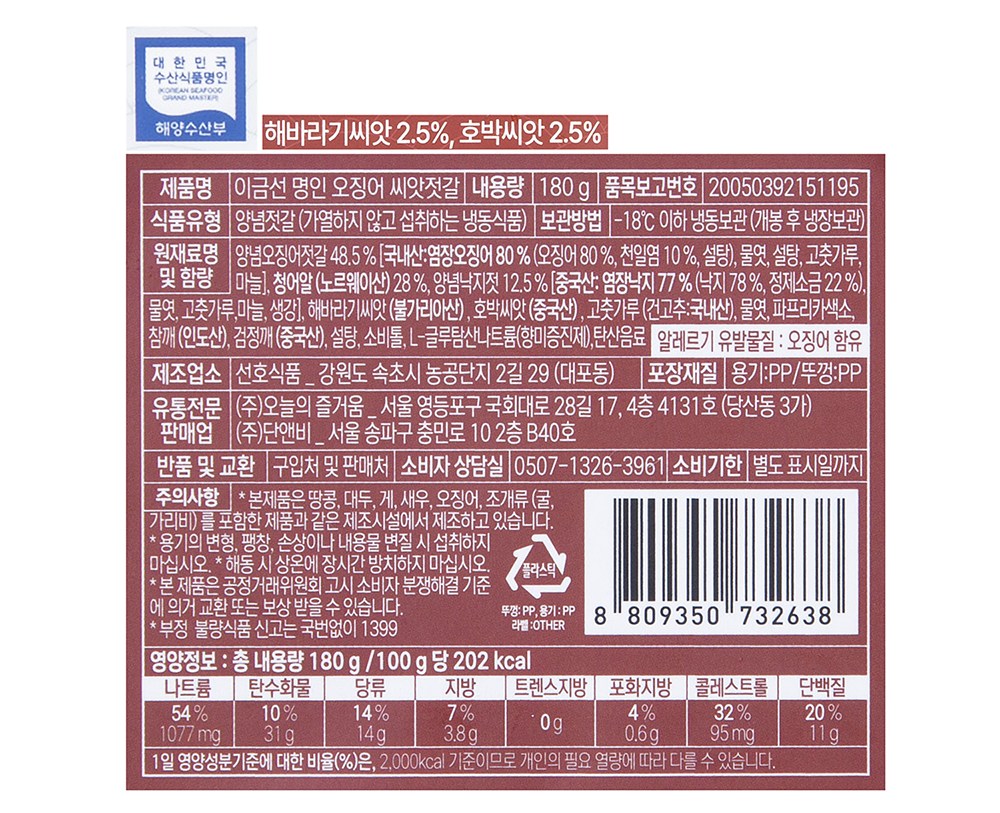 입맛 없을 땐 젓갈이 별미죠. 양념오징어젓갈, 양념낙지젓, 청어알을 사용해 쫄깃쫄깃한 식감이 매력적이에요. 여기에 해바라기 씨앗, 호박 씨앗을 함께 버무려 다양한 식감을 즐길 수 있어요. 갓 지은 밥에 씨앗 젓갈만 얹어 드셔도 그 맛이 일품이랍니다.