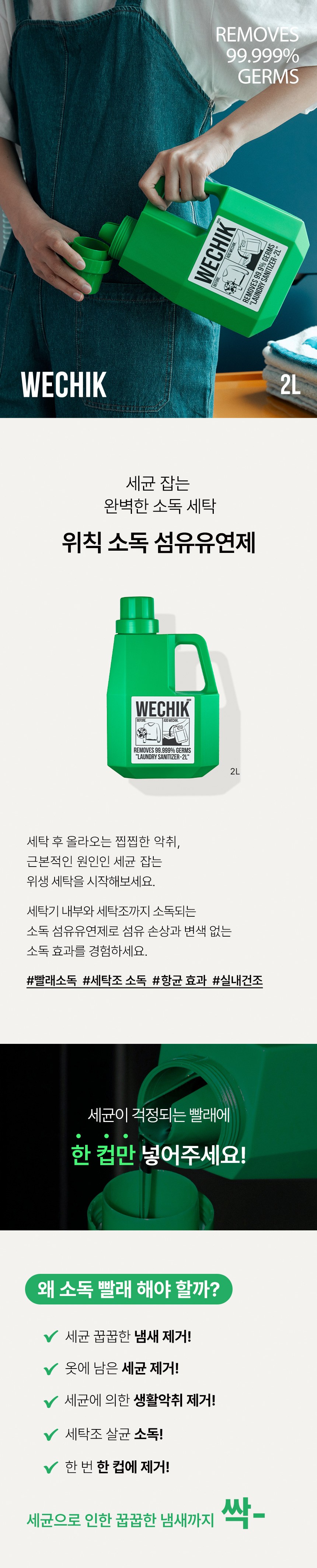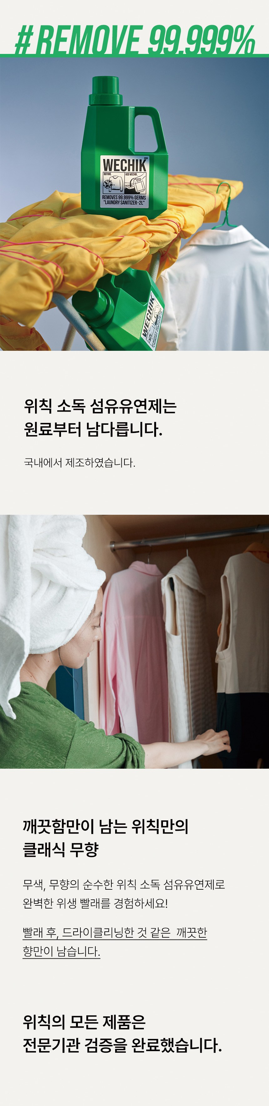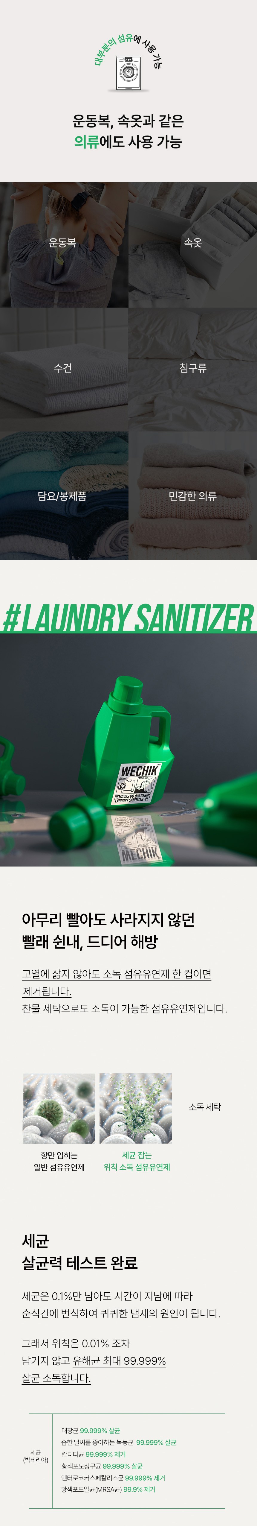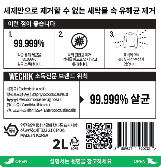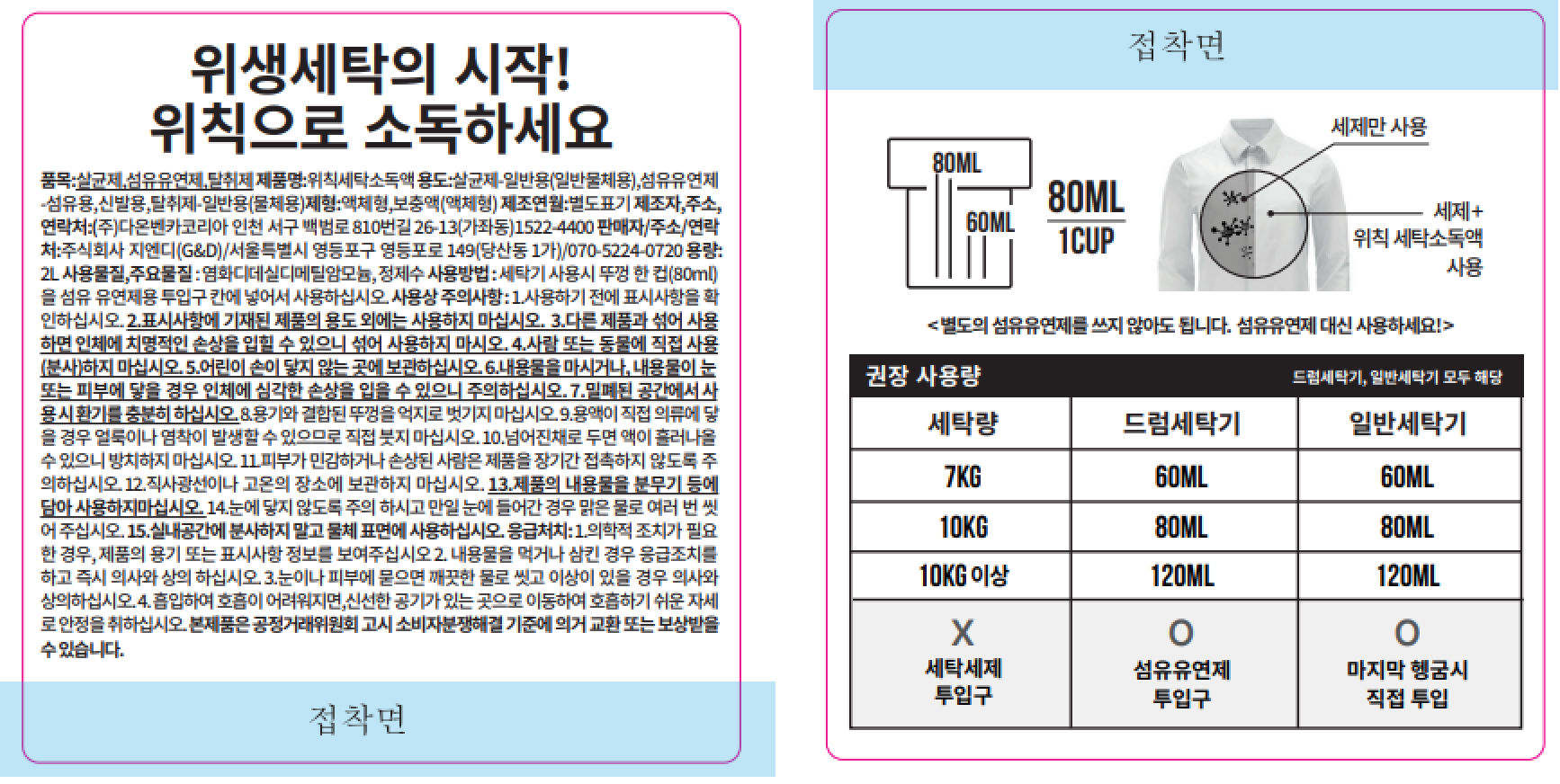 | 품목 및 제품명 | 살균제, 섬유유연제, 탈취제 / 위칙세탁소독액 | 용도(표백제의 경우 계열을 함께표시) 및 제형 | 살균제-일반용(일반물체용), 섬유유연제-섬유용, 신발용, 탈취제-일반용(물체용) / 액체형, 보충액(액체형) |