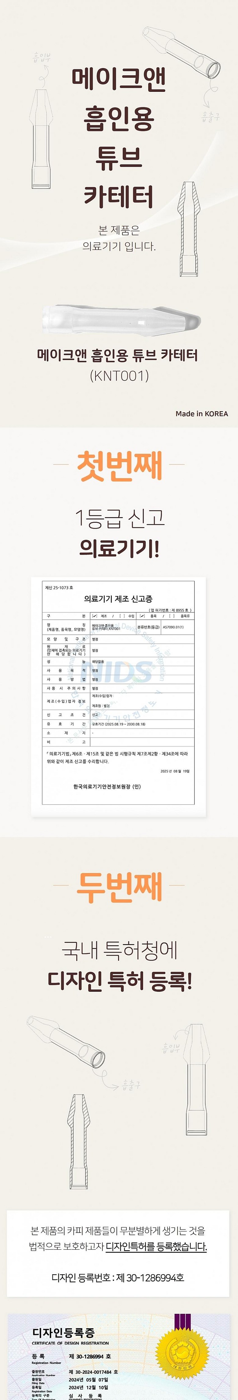 | 품명 및 모델명 | 메이크앤·흡인용 튜브·카테터,KNT001A57090.01(1) | 허가∙인증∙신고번호 (의료기기법에 따른 허가∙인증∙신고 대상 의료기기에 한함) | 의료기기 제조업 허가 번호 : 제 8955 호의료기기 품목 신고 번호 : 제신 25-1073 호의료기기 광고 심의 번호 : 조합-2025-33-030 |