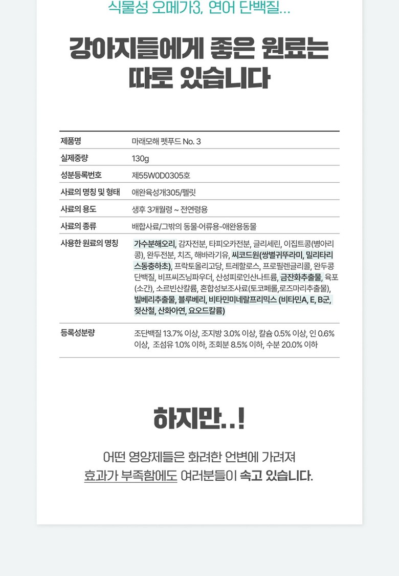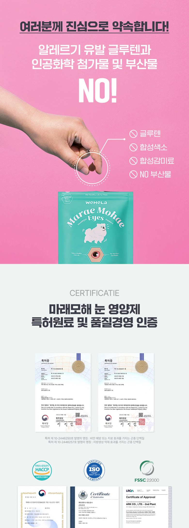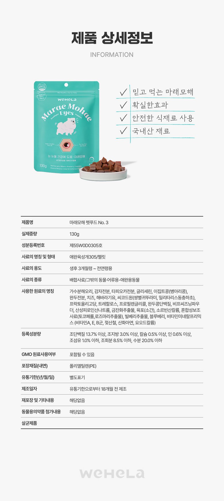 | 품명 및 모델명 | 마래모해 펫푸드 No.3 (눈.눈물) | 인증사항 | 해당없음 |