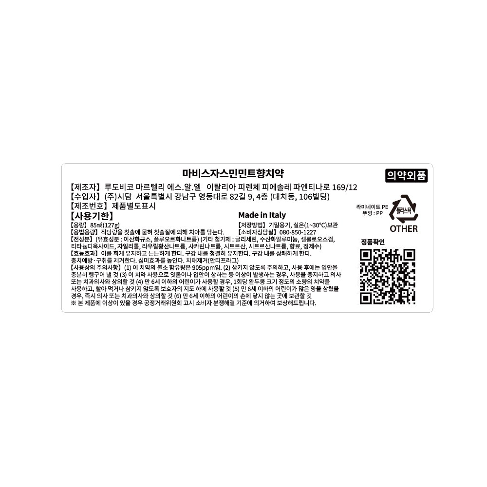 | 품명 및 모델명 | 클래식스트롱민트 85ml + 아쿠아틱민트 85ml+ 자스민민트 85ml | 인증/허가 사항 | 의약외품 |